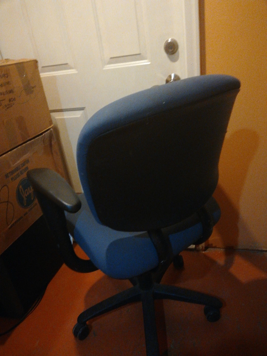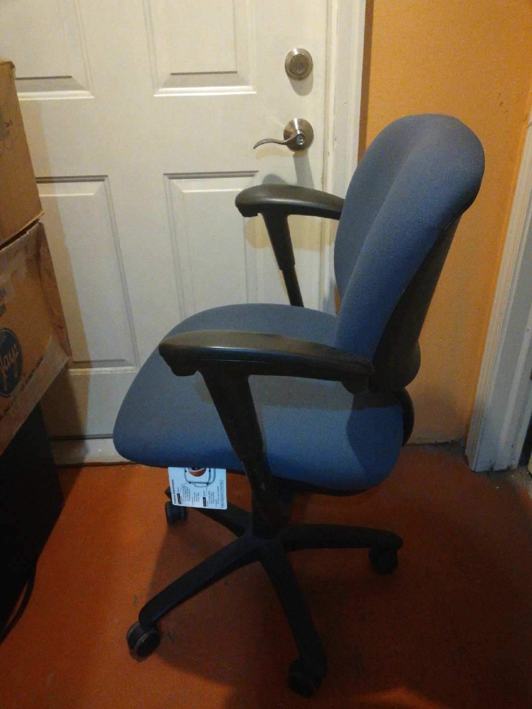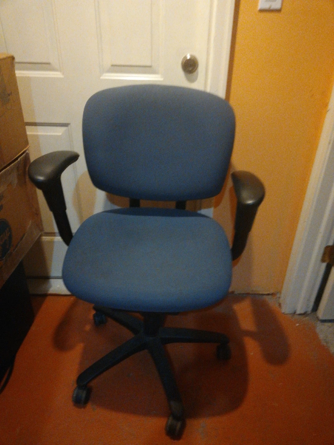 Selling a comfortable blue office chair. It has a sturdy base with wheels for easy movement. The chair has adjustable armrests and a supportive back. Perfect for your home office or workspace