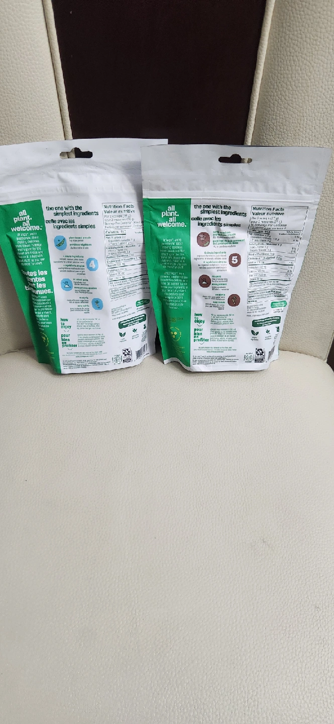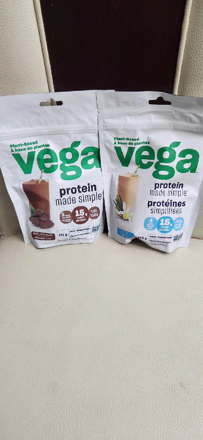 I have two bags of Vega Protein Made Simple. One is dark chocolate flavour (271 g) and the other is vanilla flavour (259 g). They are both plant-based. Expiry date is June 10, 2026.