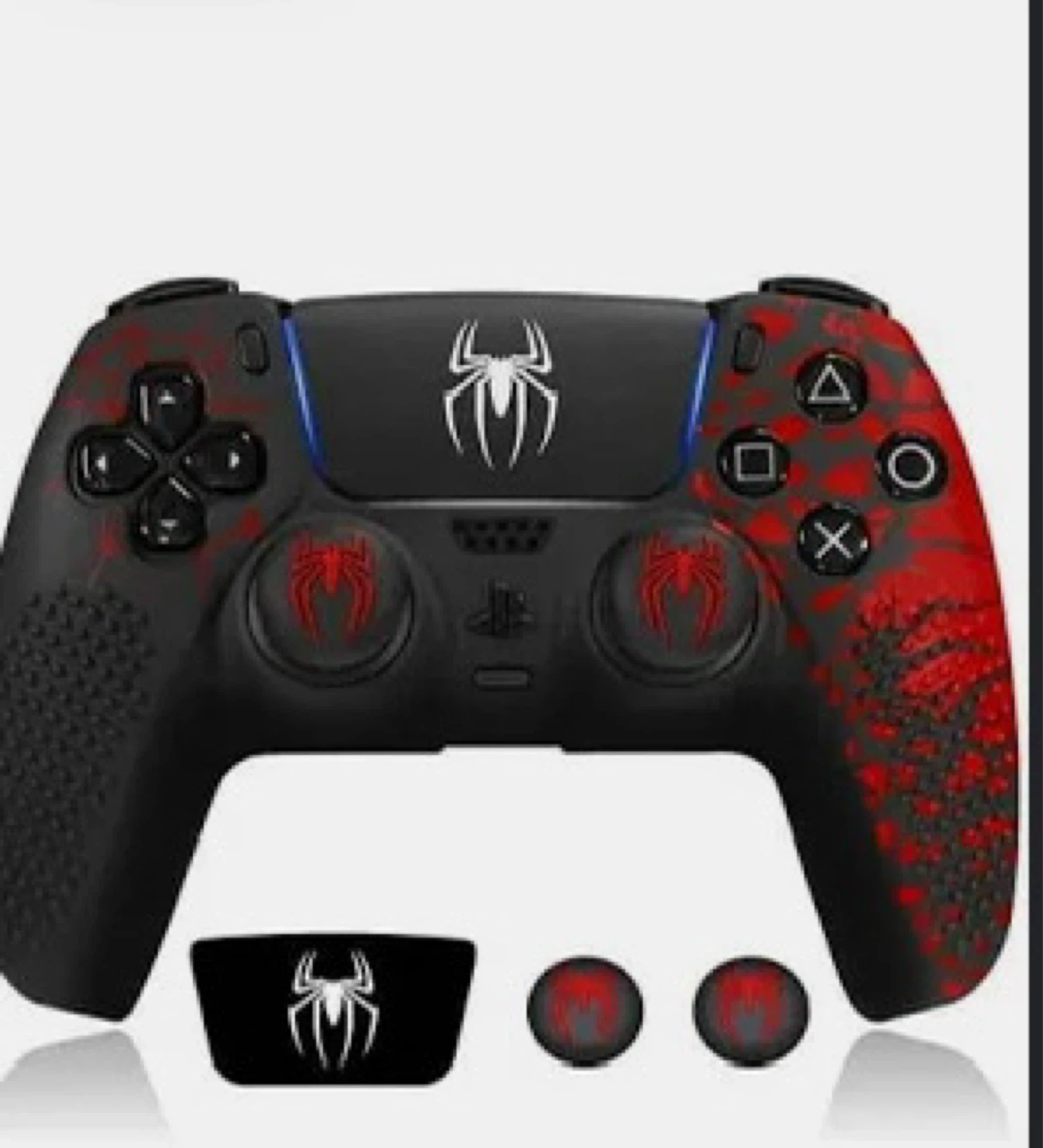 Selling a custom-designed PlayStation 5 (PS5) controller with a Spider-Man theme! The controller features a unique black and red design with Spider-Man logos. It also includes additional accessories as seen in the picture