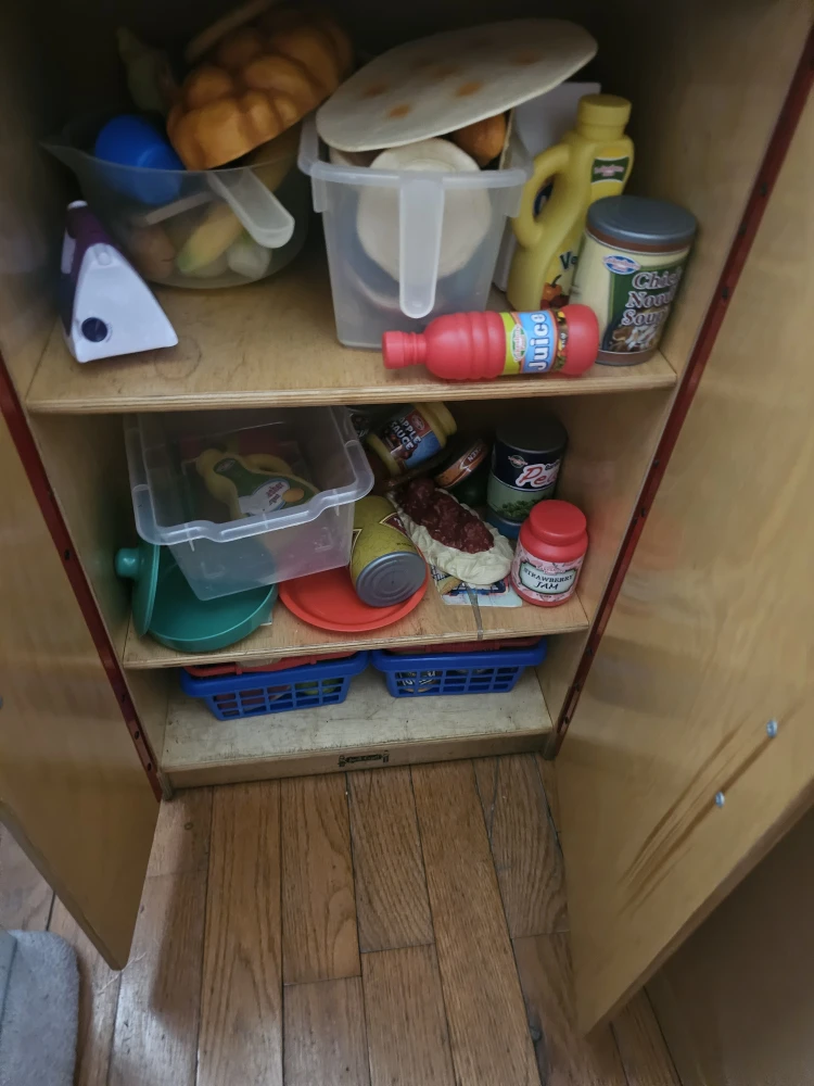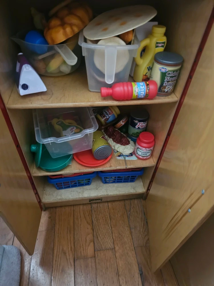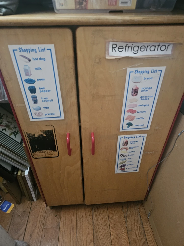 Selling a play refrigerator with play food. It's in good condition and ready for a new home. Comes with shopping list and variety of play food items