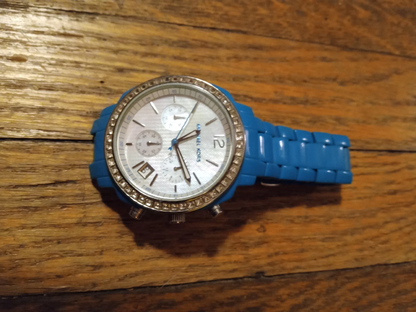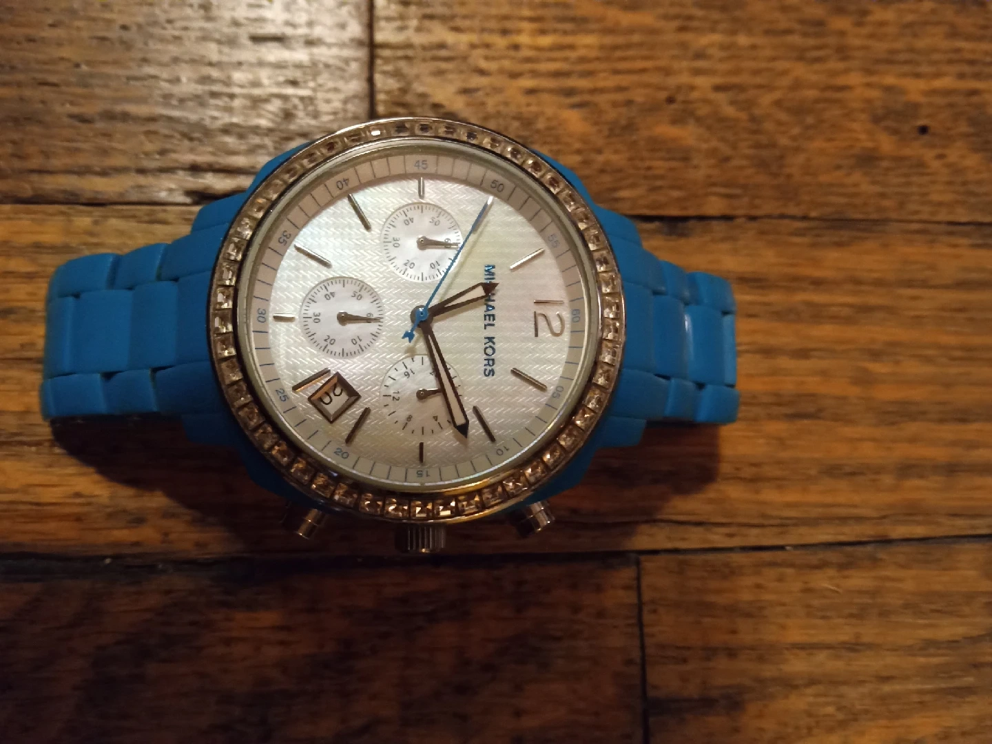 Selling a Michael Kors ladies watch with a vibrant blue band. The watch face is a beautiful pearl colour and features chronograph dials. The bezel is adorned with sparkling stones, adding a touch of elegance to this stylish timepiece