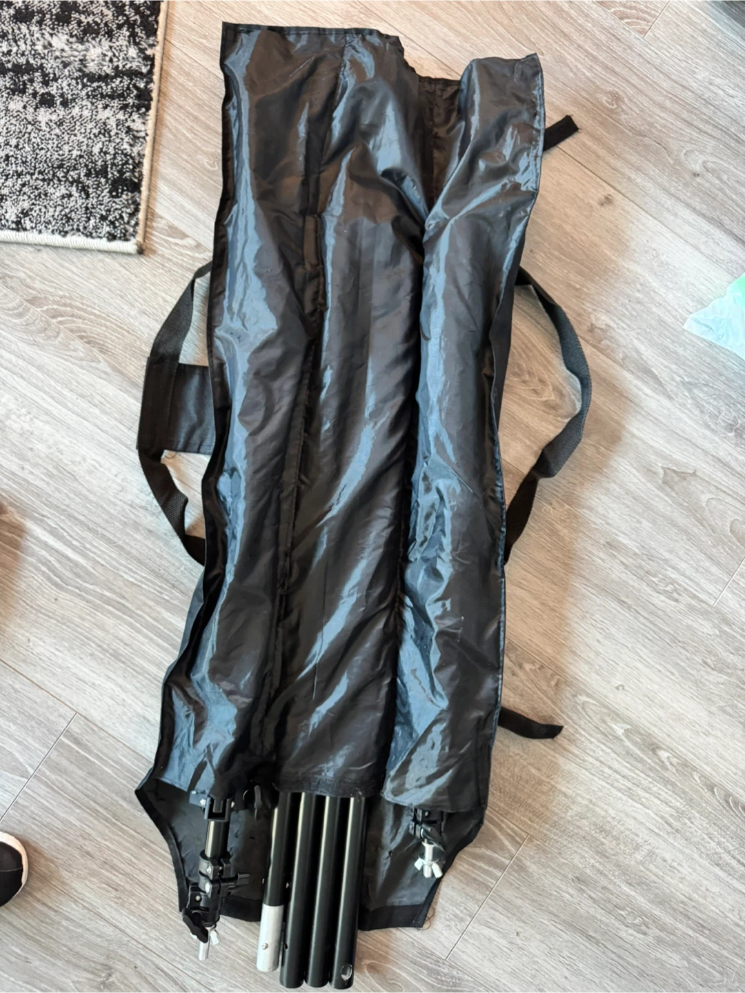 Backdrop stand with green,black and white backdrop. Adjustable and really easy to use.