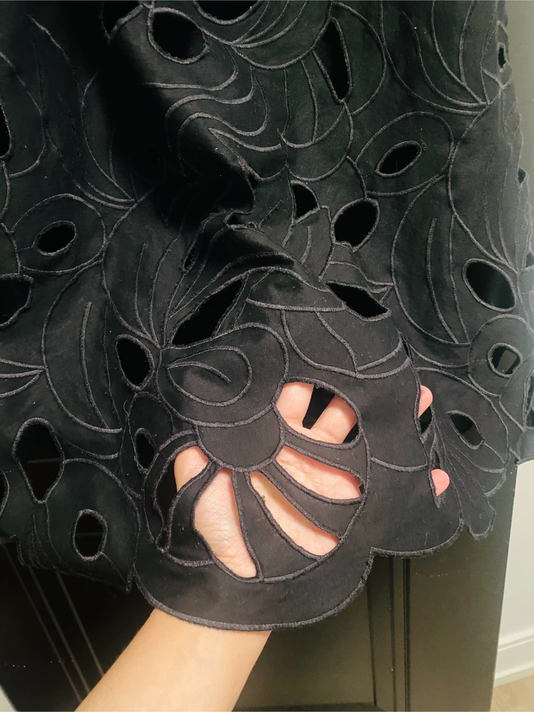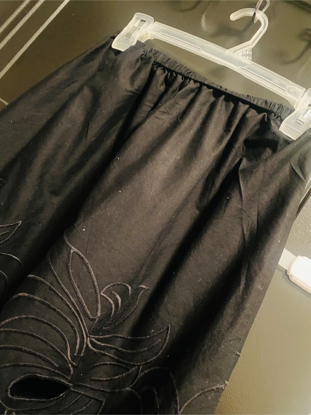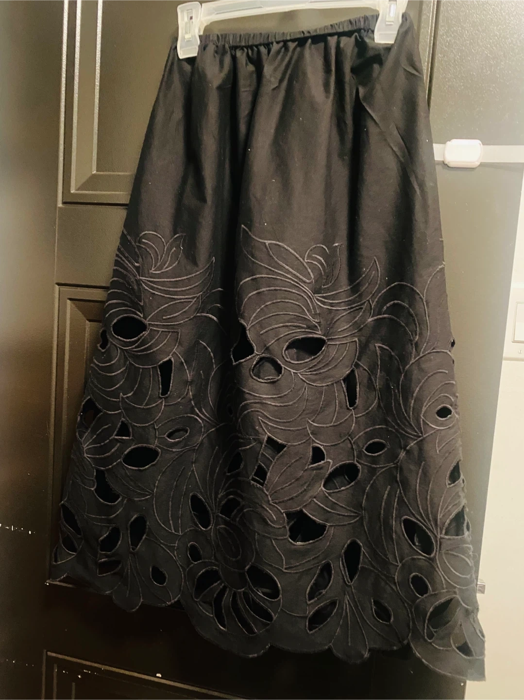 Selling a cute H&M black skirt in size XS! It features a lovely embroidered design. The shell is made of 100% cotton and the embroidery is 100% polyester. It's in great condition and ready for a new home!