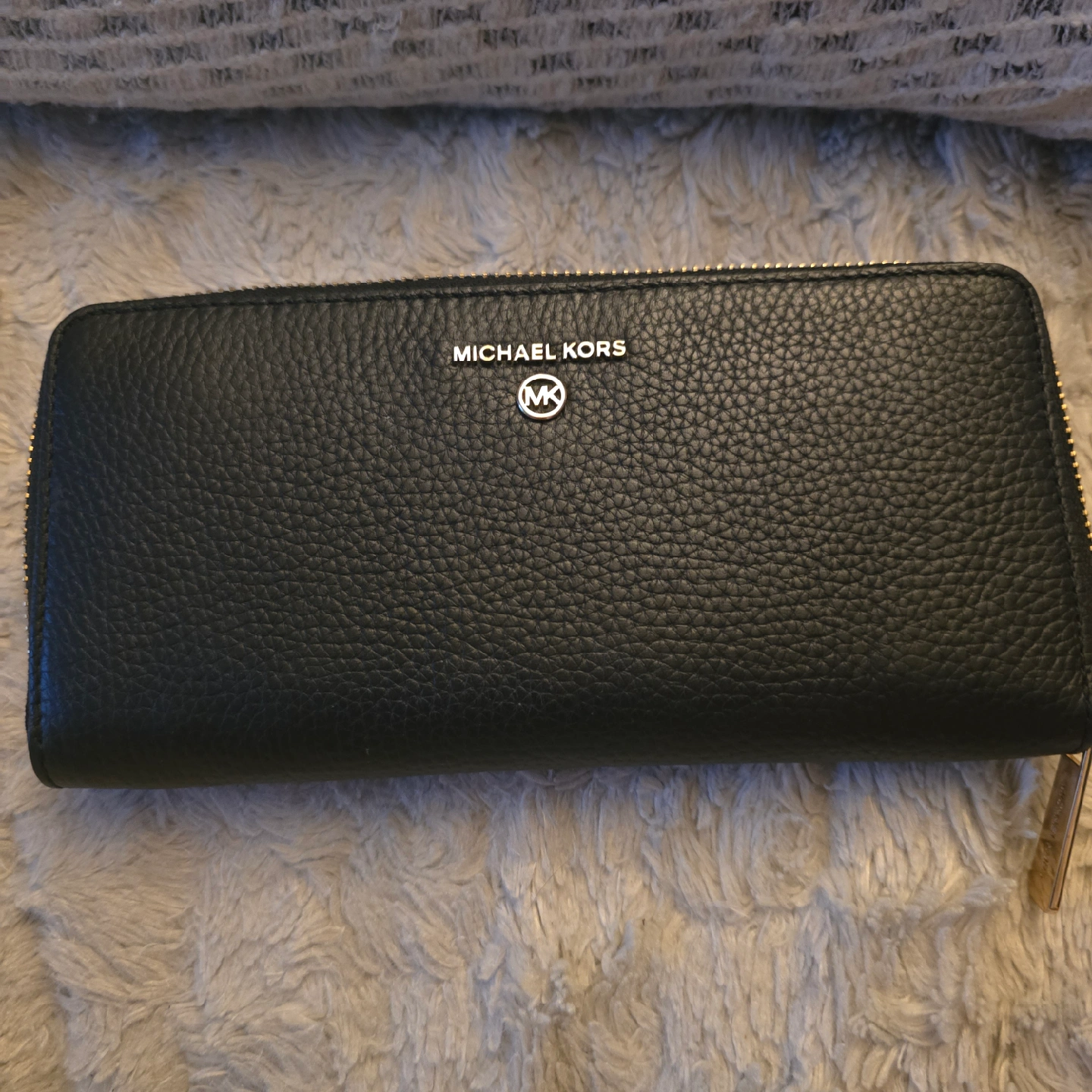 Michael Kors wallet in black leather. It's in great condition and has lots of space for cards and cash, plus a zippered closure to keep everything secure. Perfect for every day use :)
