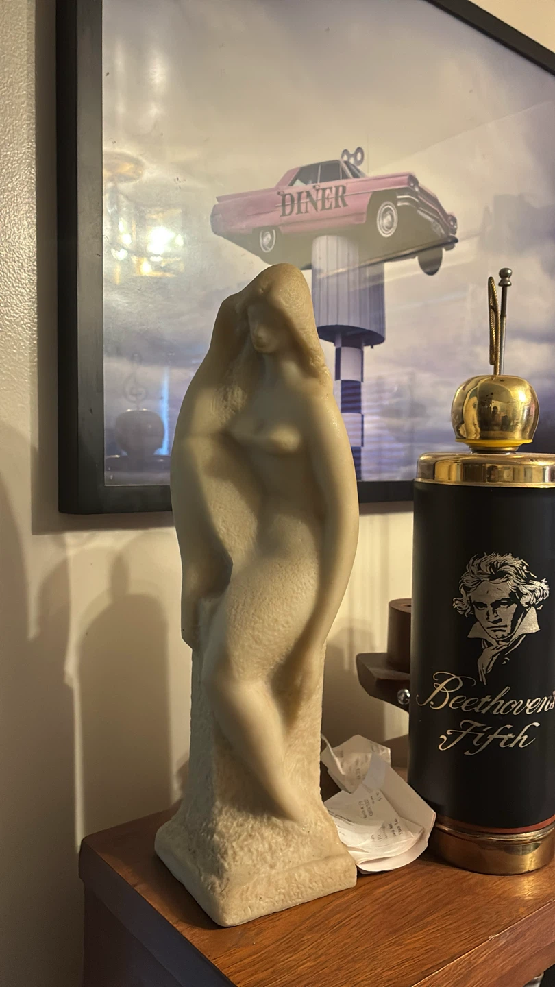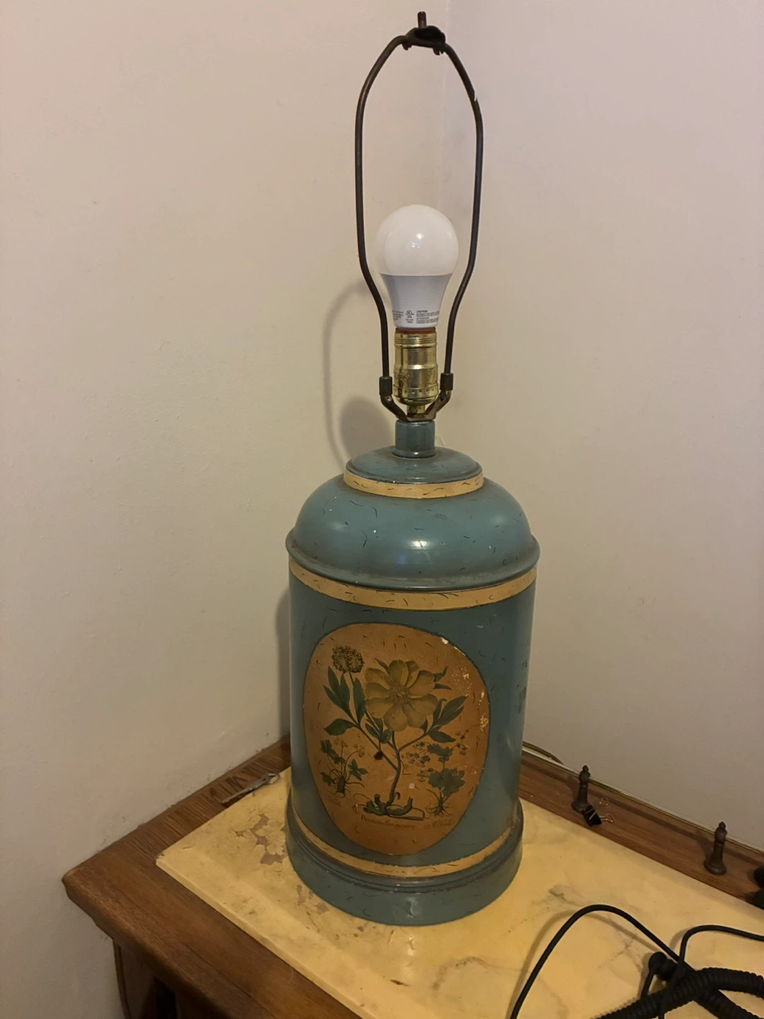 I have a vintage-style table lamp available. It features a unique blue color with a floral design. It would be a great addition to any room!