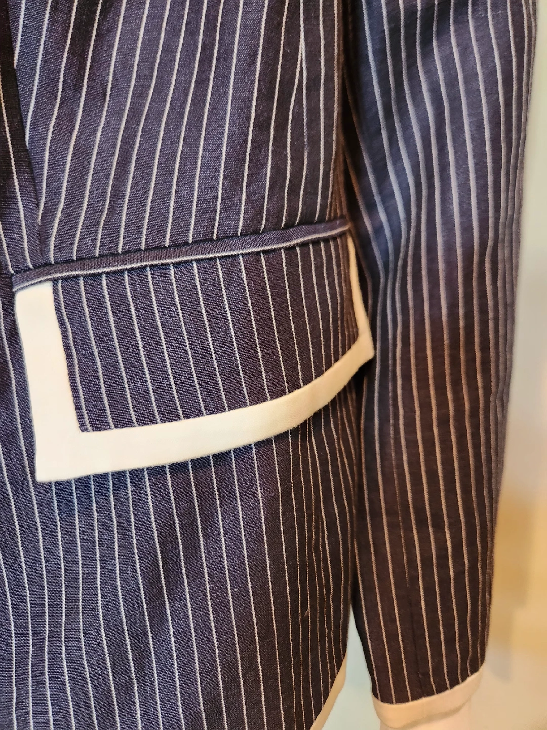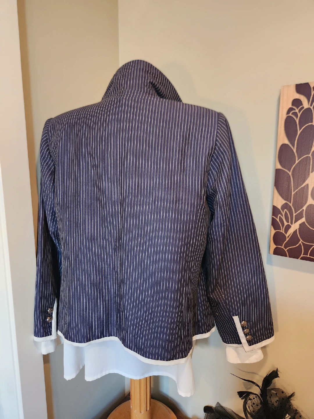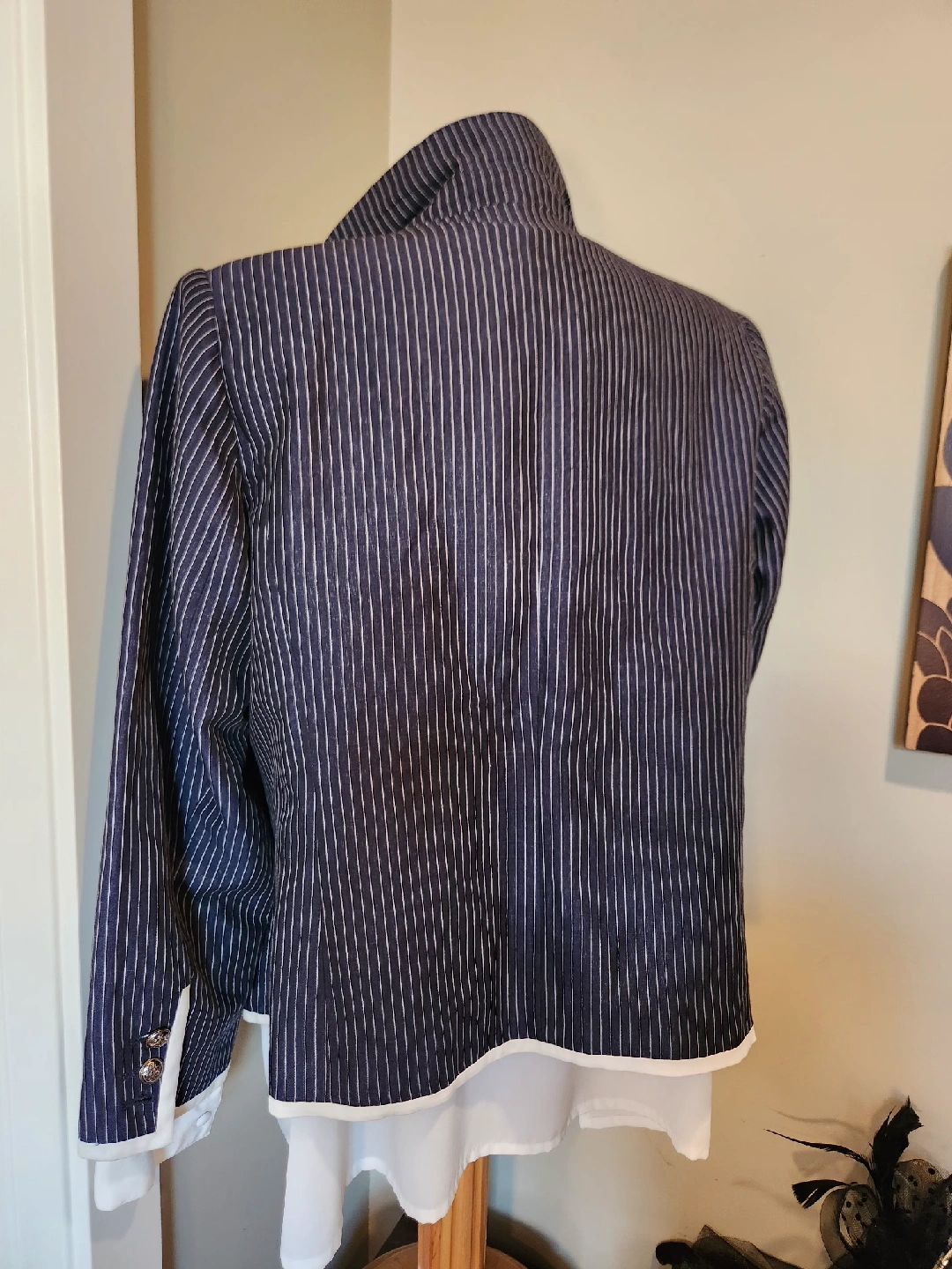 A stylish navy blue blazer with white pinstripes and trim. It has a double-button closure and a unique design. Roomy fit Linen fabric is fantastic for warm weather travel, classic rowing style adds a touch of sophistication to any outfit. Size 18 fits 18-24.