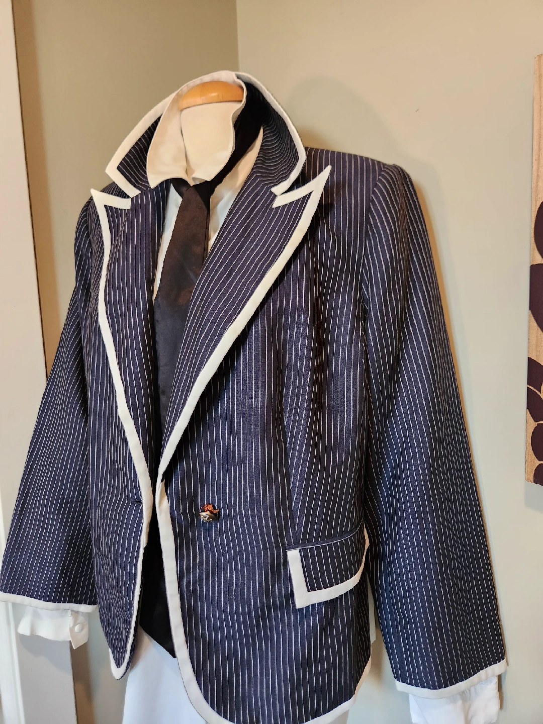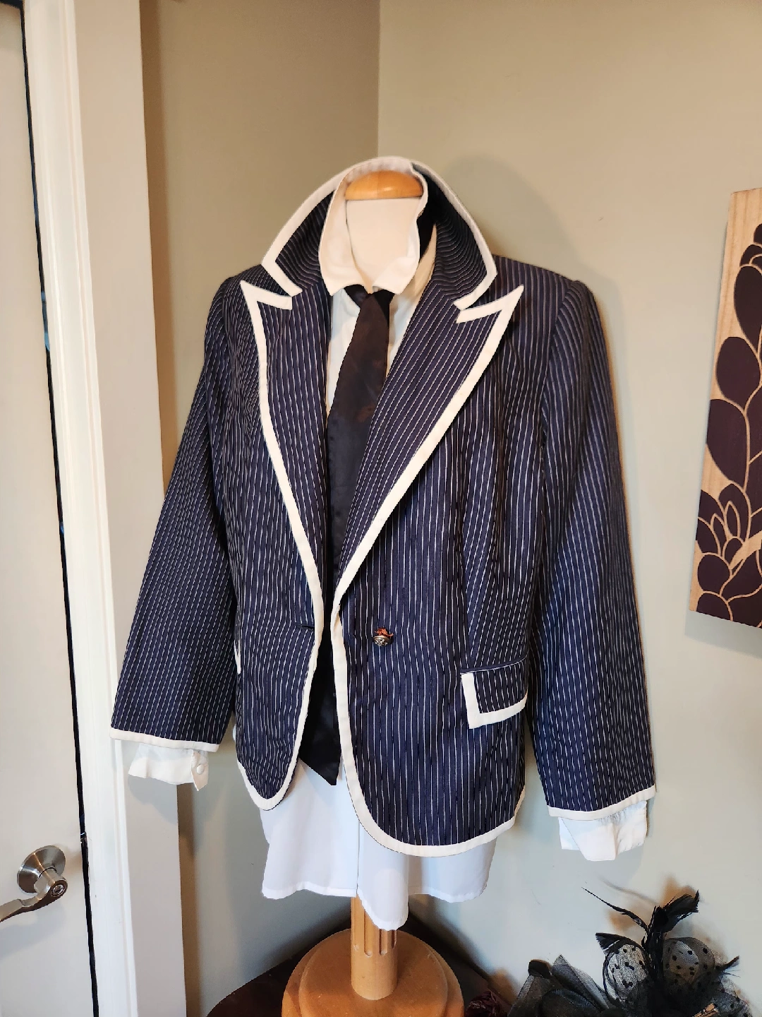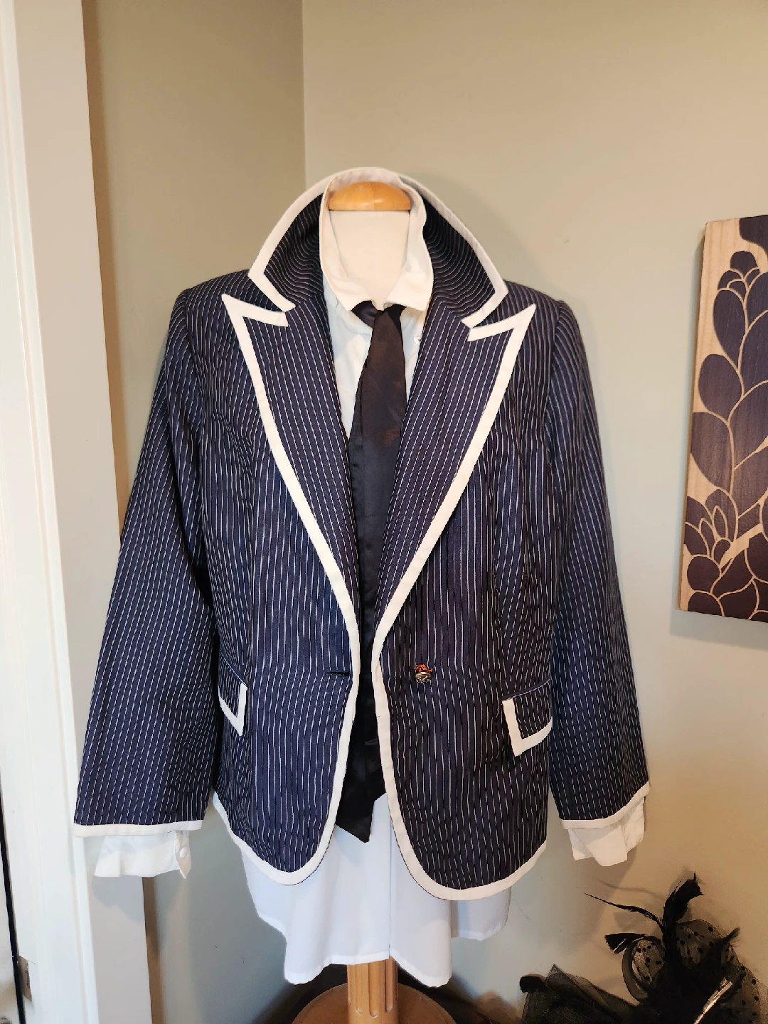 A stylish navy blue blazer with white pinstripes and trim. It has a double-button closure and a unique design. Roomy fit Linen fabric is fantastic for warm weather travel, classic rowing style adds a touch of sophistication to any outfit. Size 18 fits 18-24.