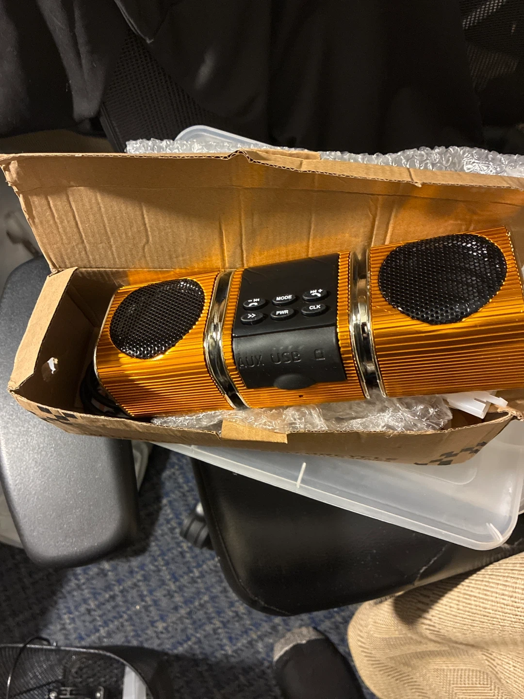 10Selling a portable speaker with a gold finish! It has buttons for mode, power, and clock settings, along with options for volume and track control. There's also an AUX and USB port for connectivity. Comes in the original box for Bicycle bike