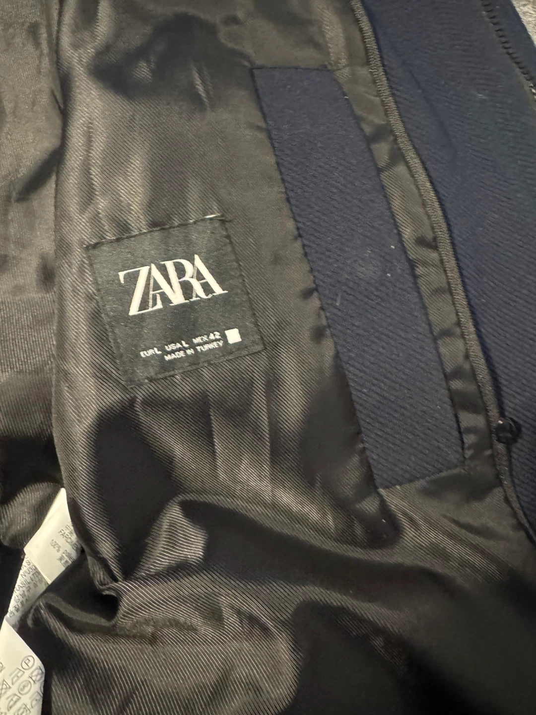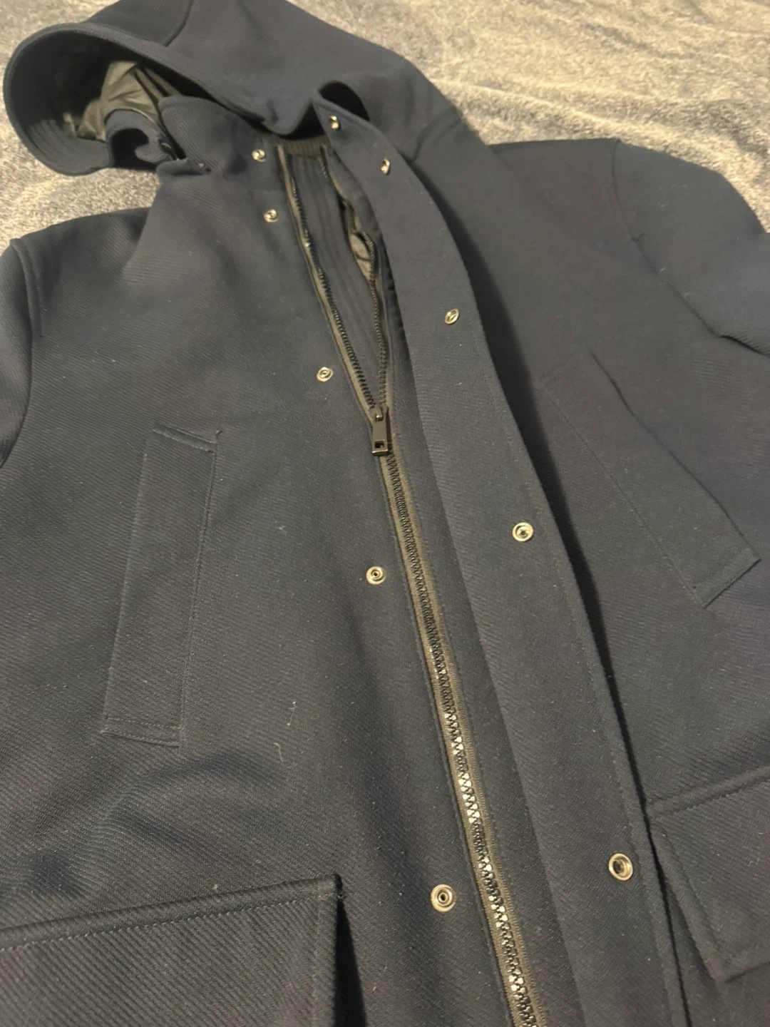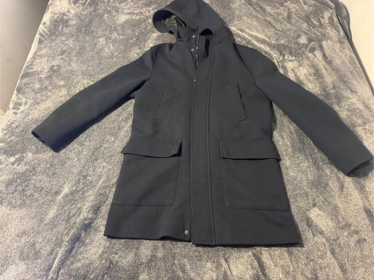 Selling a Zara navy blue hooded coat in size L. with a wool blend material. Great for keeping warm and stylish during the colder months!
