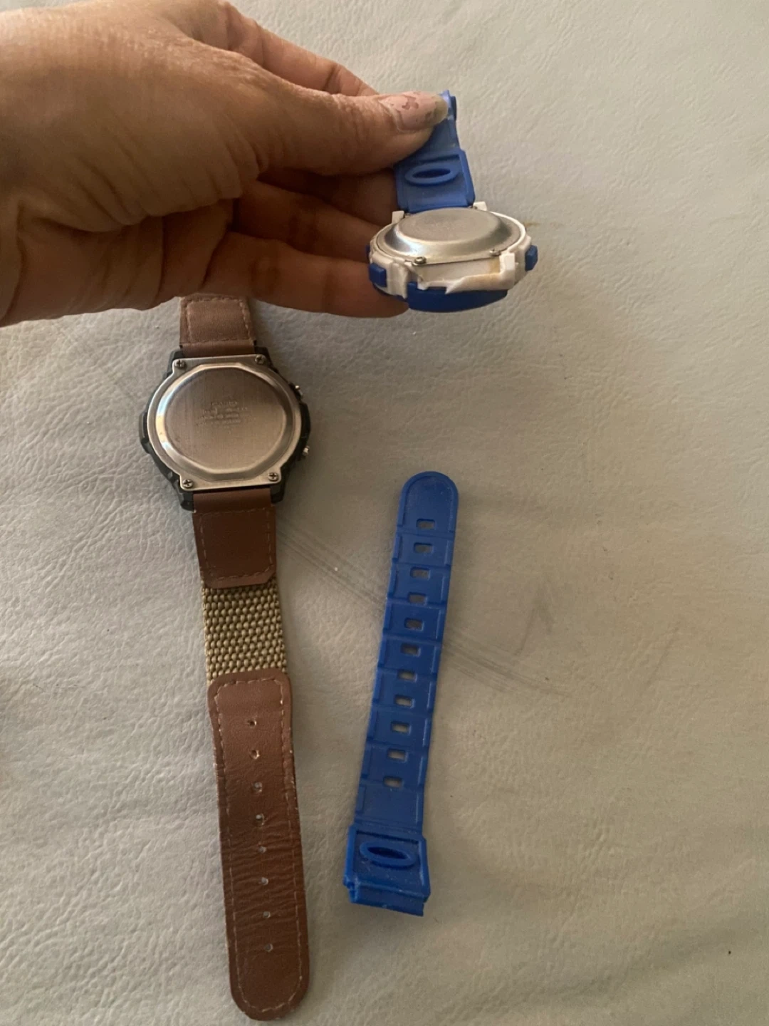 Selling two digital watches as pictured. One watch has a brown and green strap, the other watch has a blue strap. Both watches for $4 need battery as is