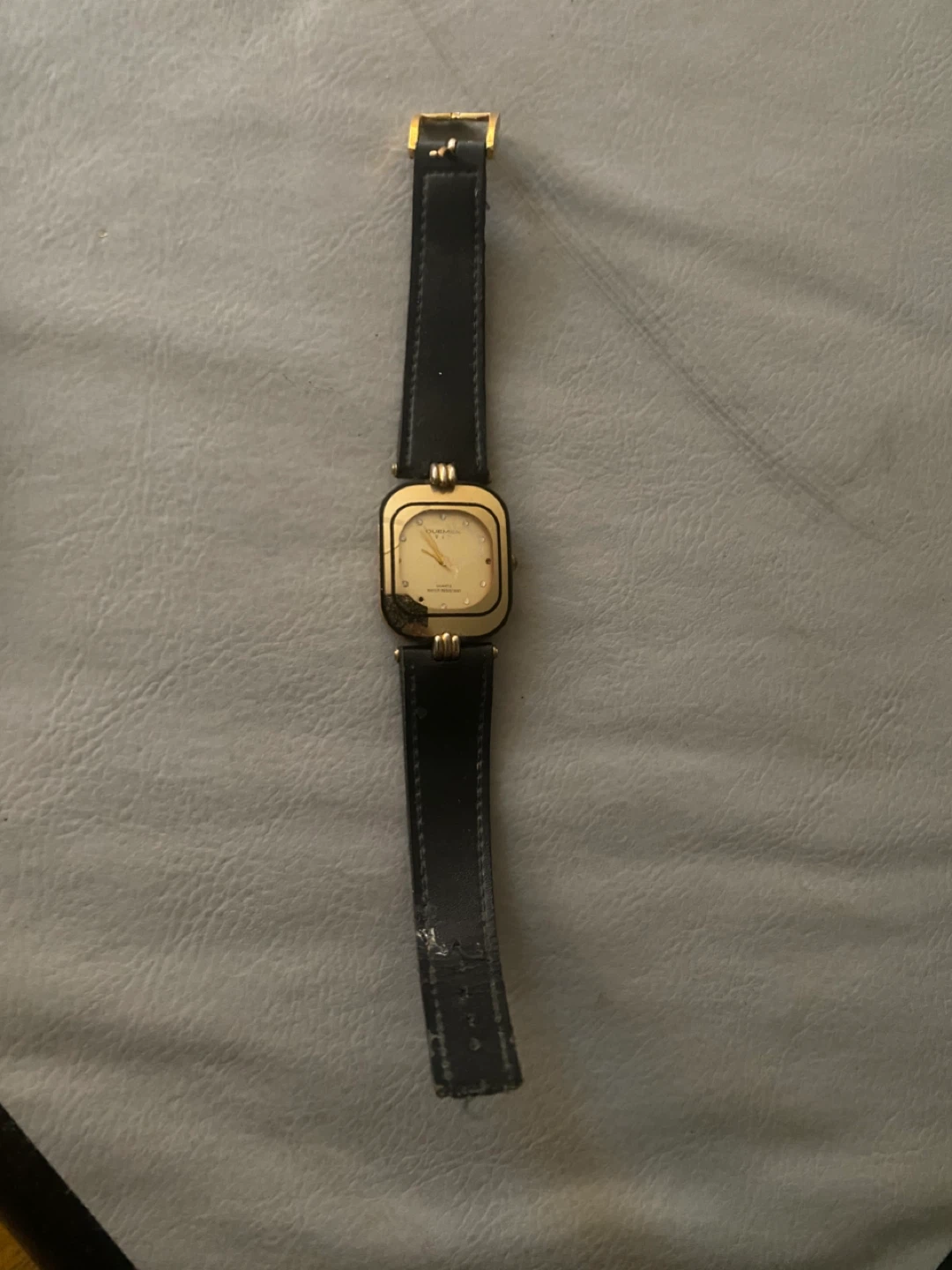 Selling a Quemex Quartz watch with a gold face and black leather band. It shows signs of wear on the band, as pictured no idea if working as is