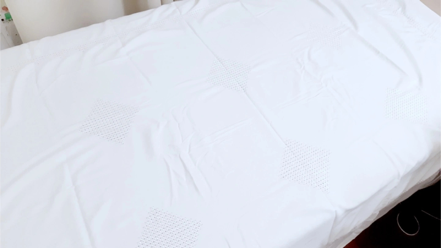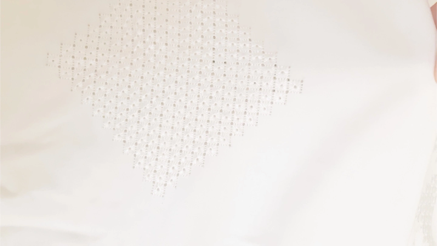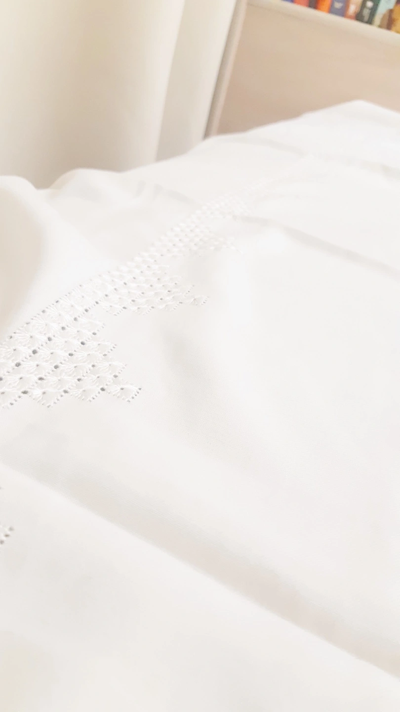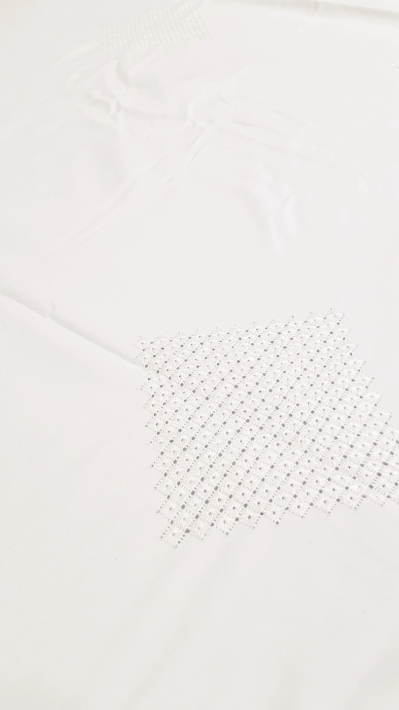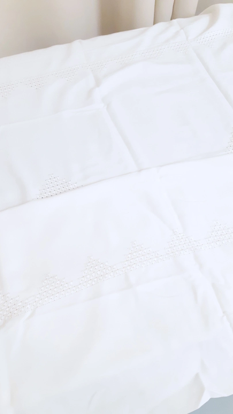Hand stiched pure white, 42 inches by 63 inches, approximately and room for cutting. Vintage material, never used. Perfect for a 6-person table