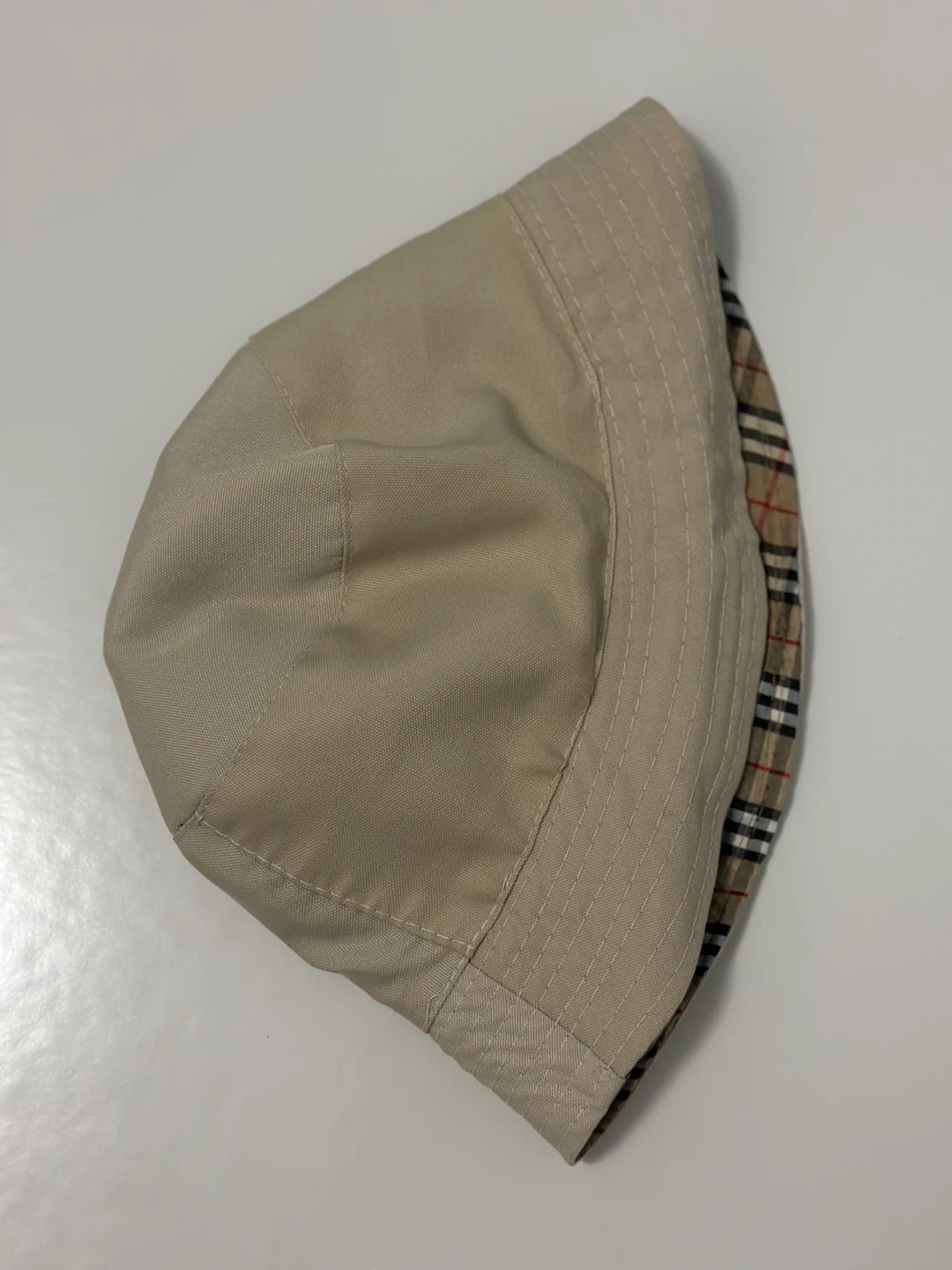 This is a Burberry-like reversible bucket hat. One side is beige and the other has the classic Burberry-like check pattern. It's in great condition and ready for a new home!