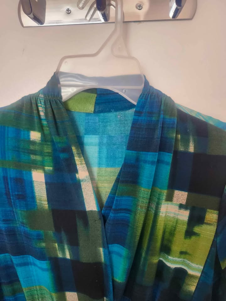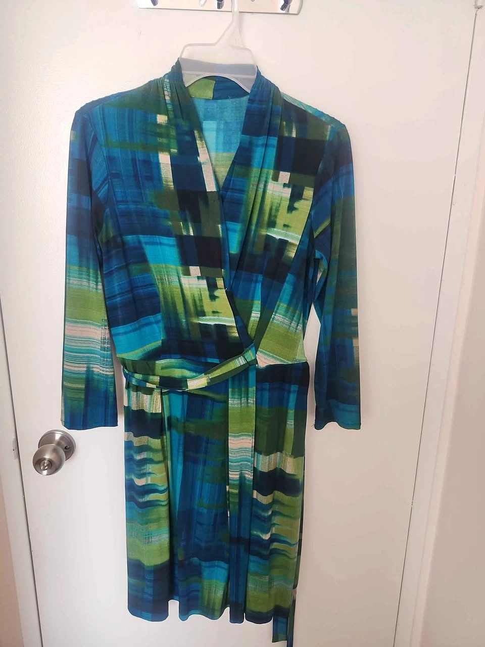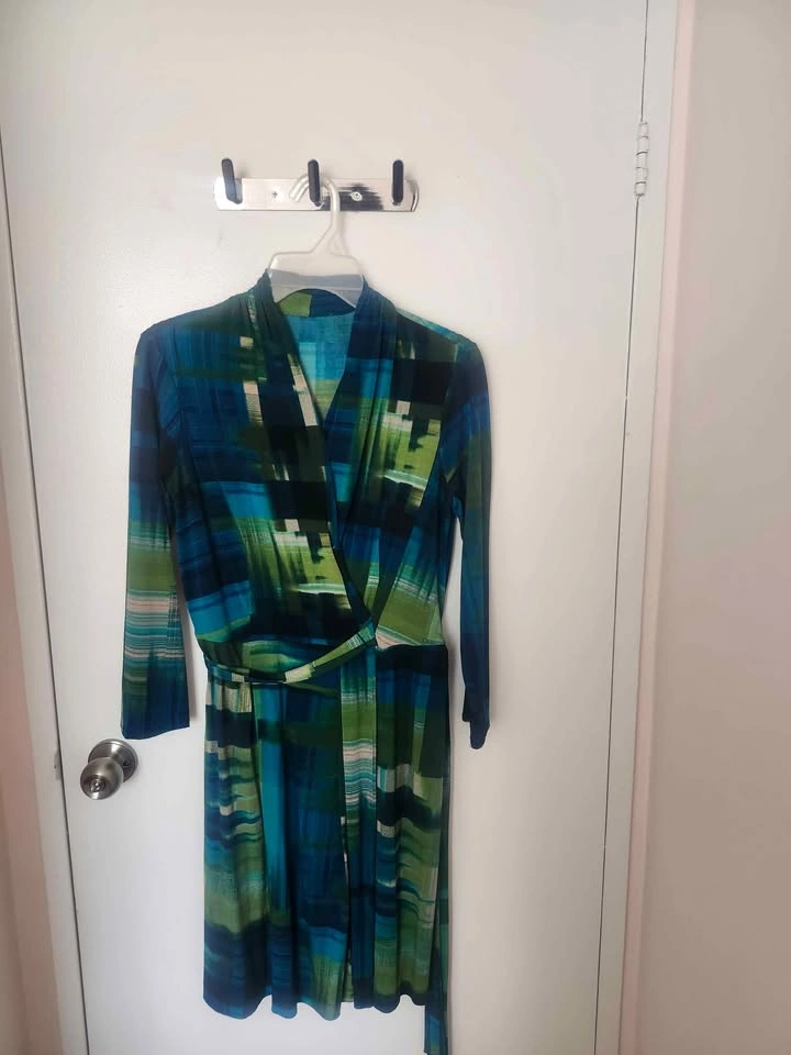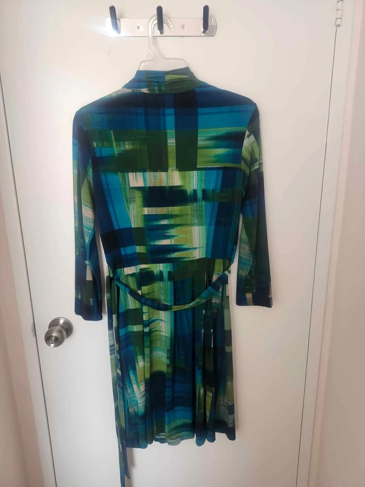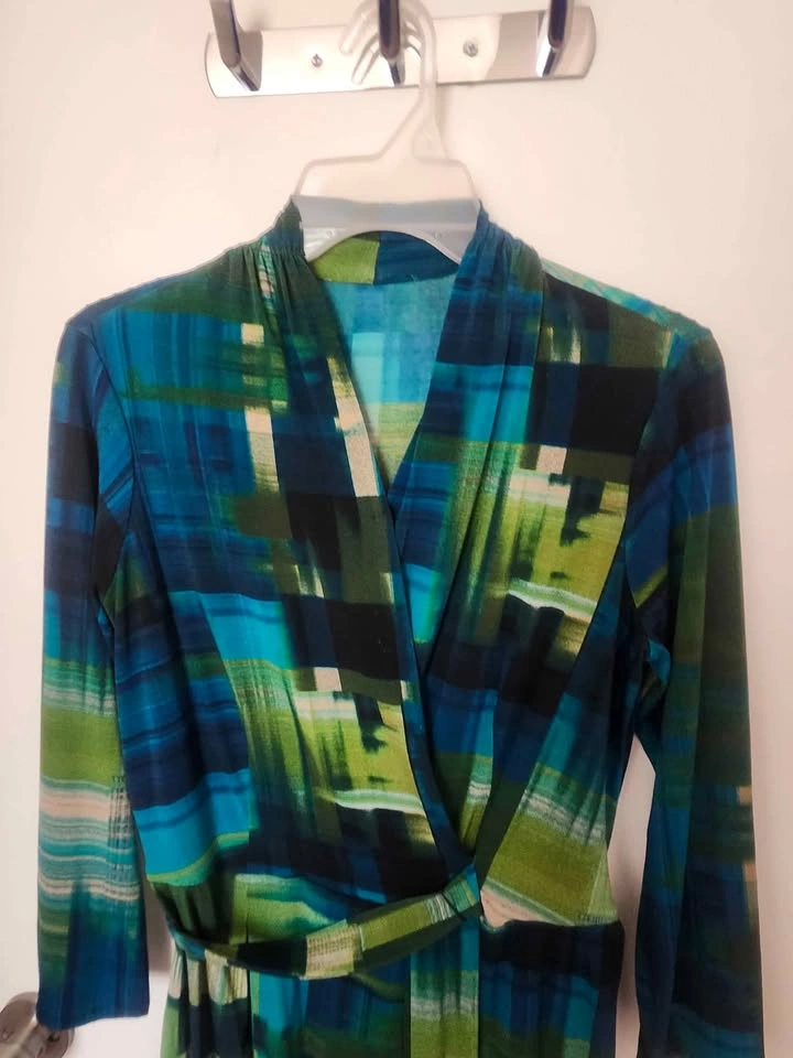 Stylish and comfortable wrap dress with long sleeves and a tie belt. Features a bold multicolored abstract print in shades of blue, green, and teal. Perfect for casual outings, work, brunch, or dressing up with heels for a night out!