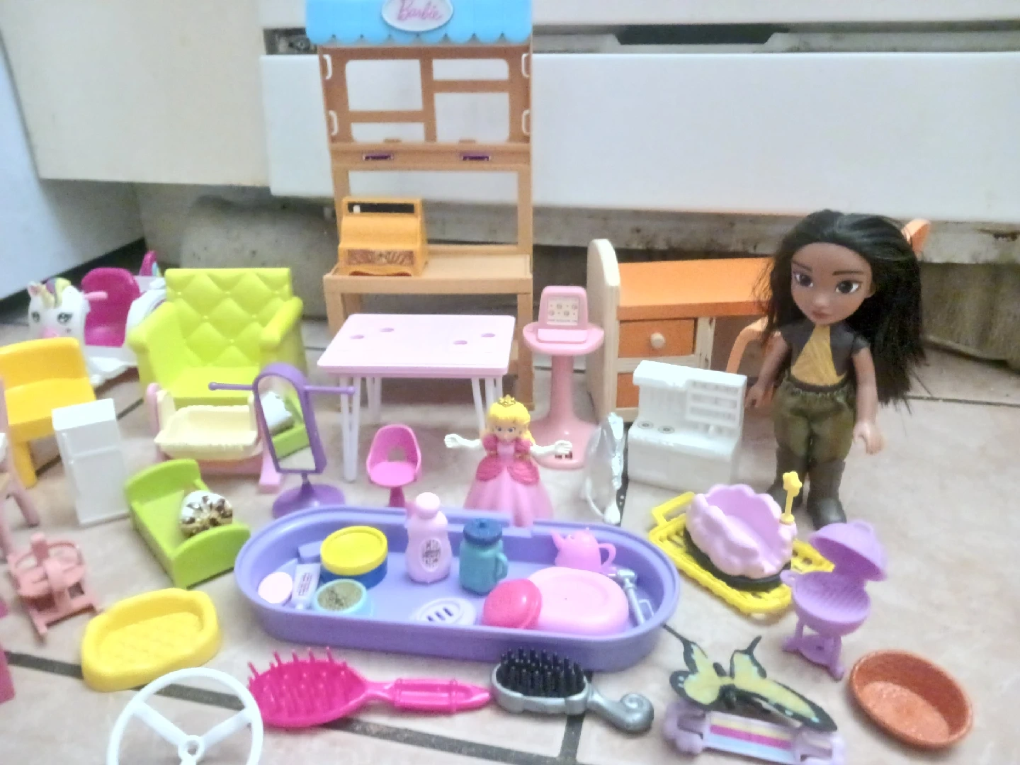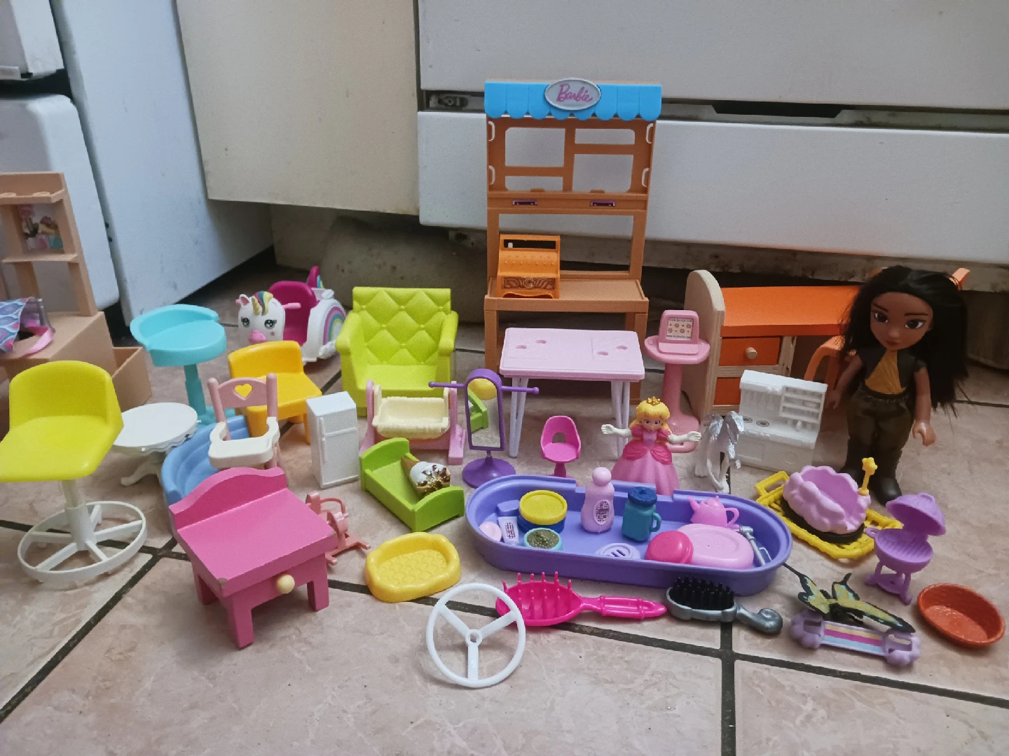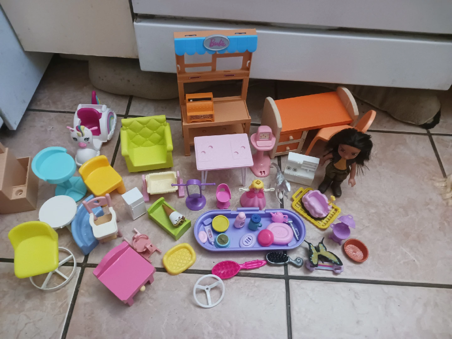 A cute collection of Barbie dollhouse furniture and accessories! Includes chairs, tables, a vanity, and various smaller items to furnish your dollhouse. Perfect for imaginative play and creating a fun Barbie world. Willing to sell with other barbie postings!