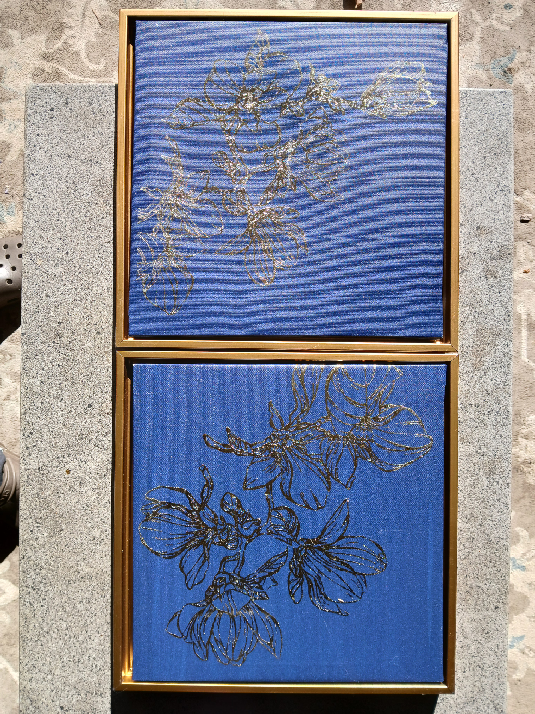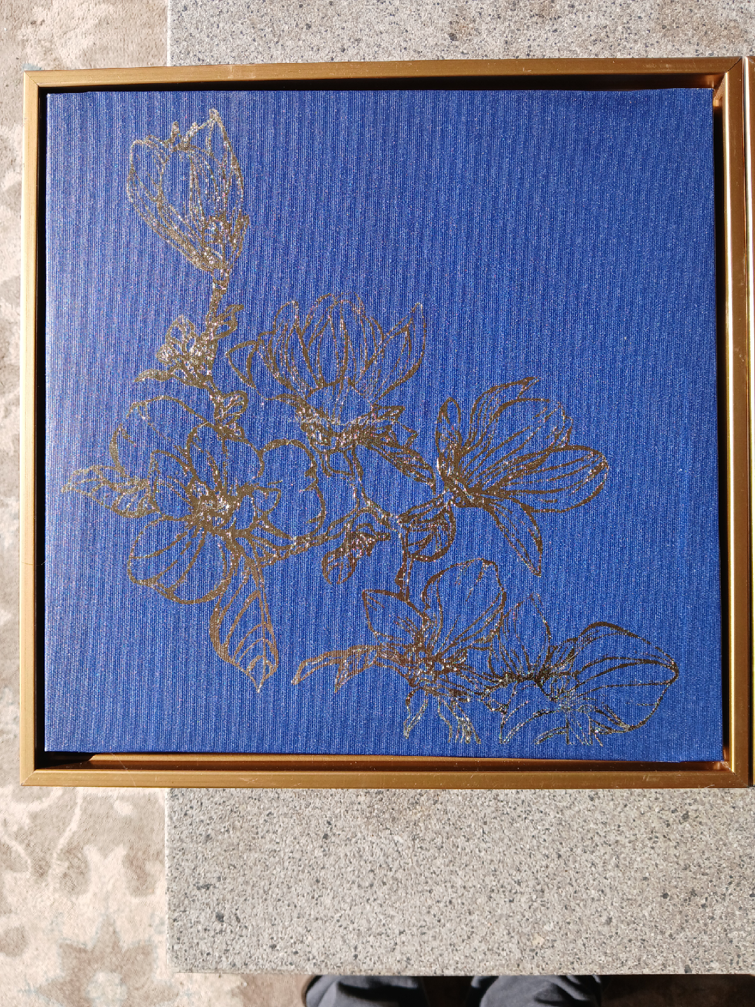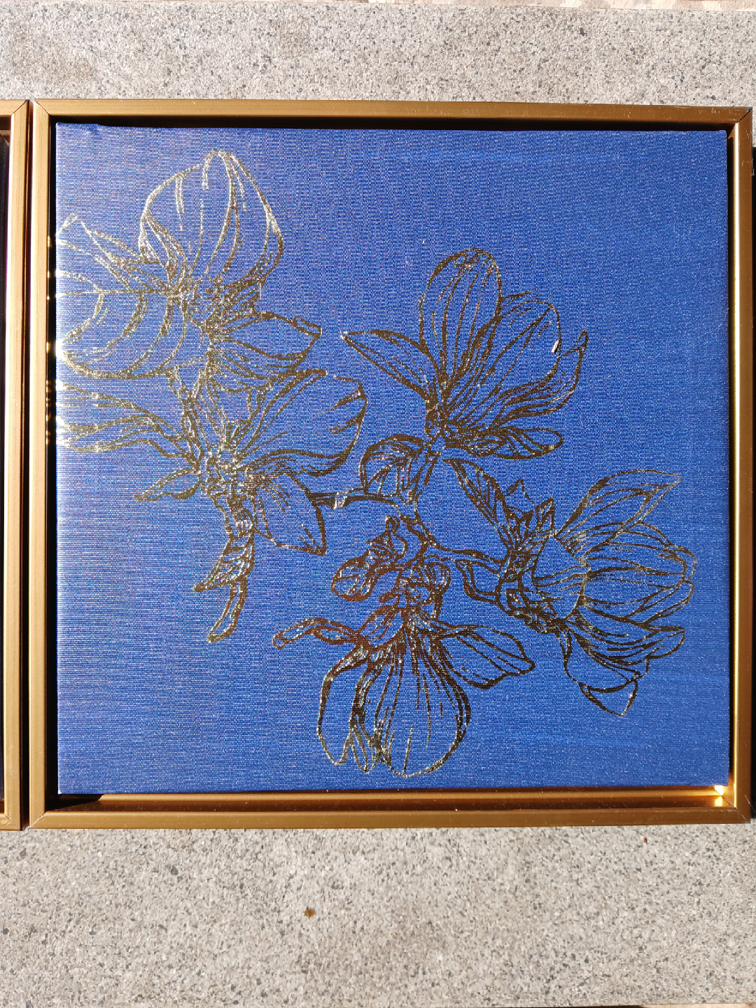 Selling a set of two framed art pieces! They feature a beautiful floral design in gold on a blue background. The frames are also a lovely gold colour. These would look great in any room!