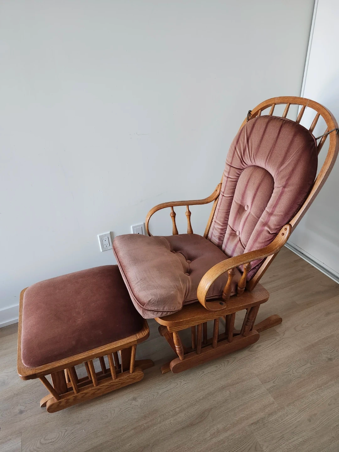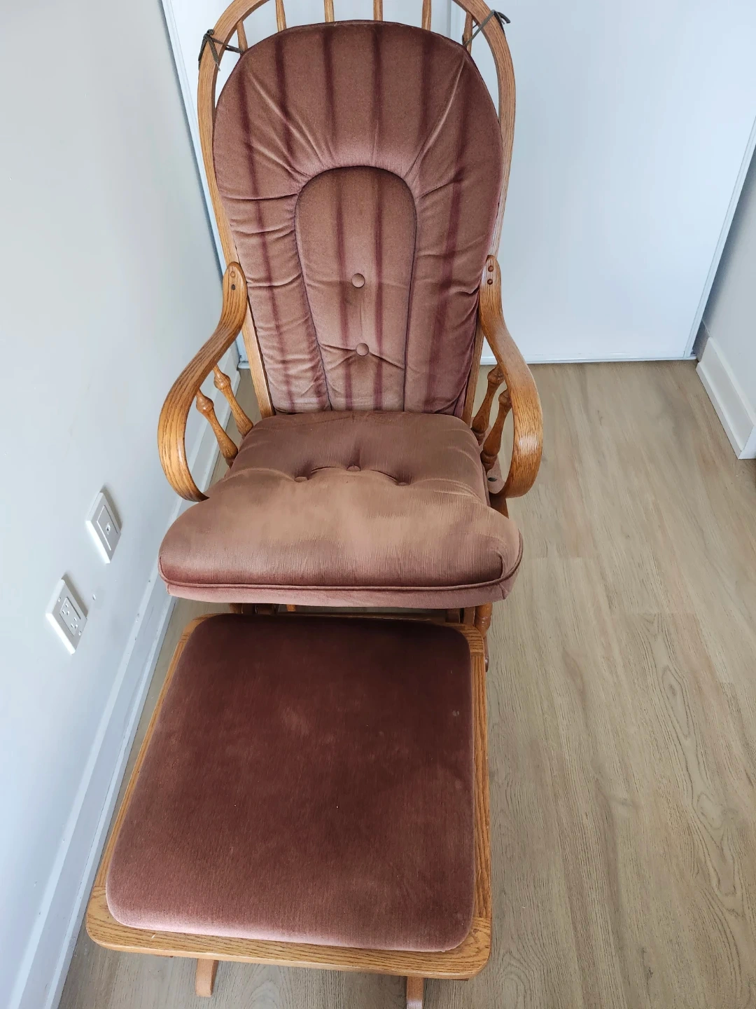 This wooden rocking chair comes with a matching ottoman. It features plush brown velour cushions for comfort. Perfect for a nursery or a cozy reading corner!