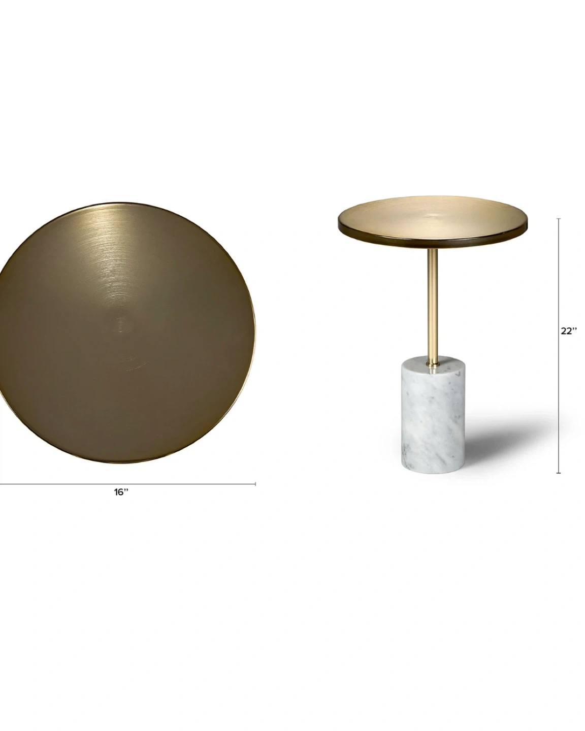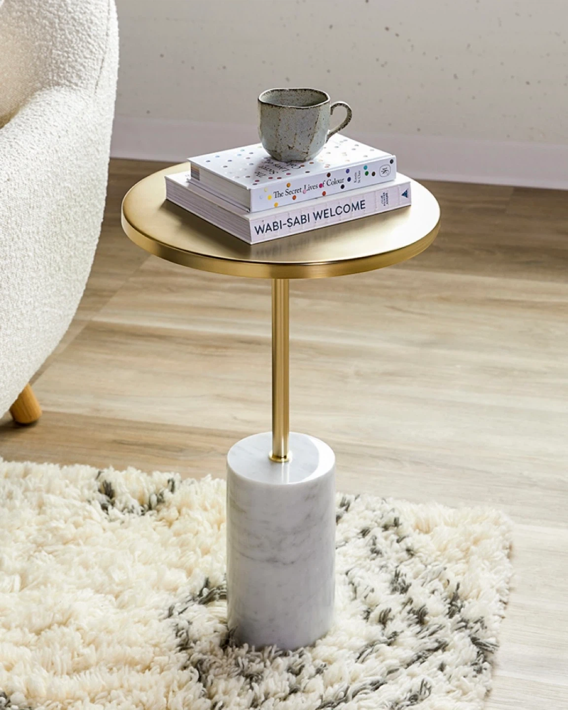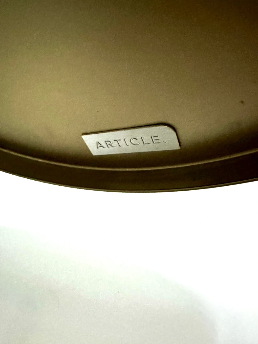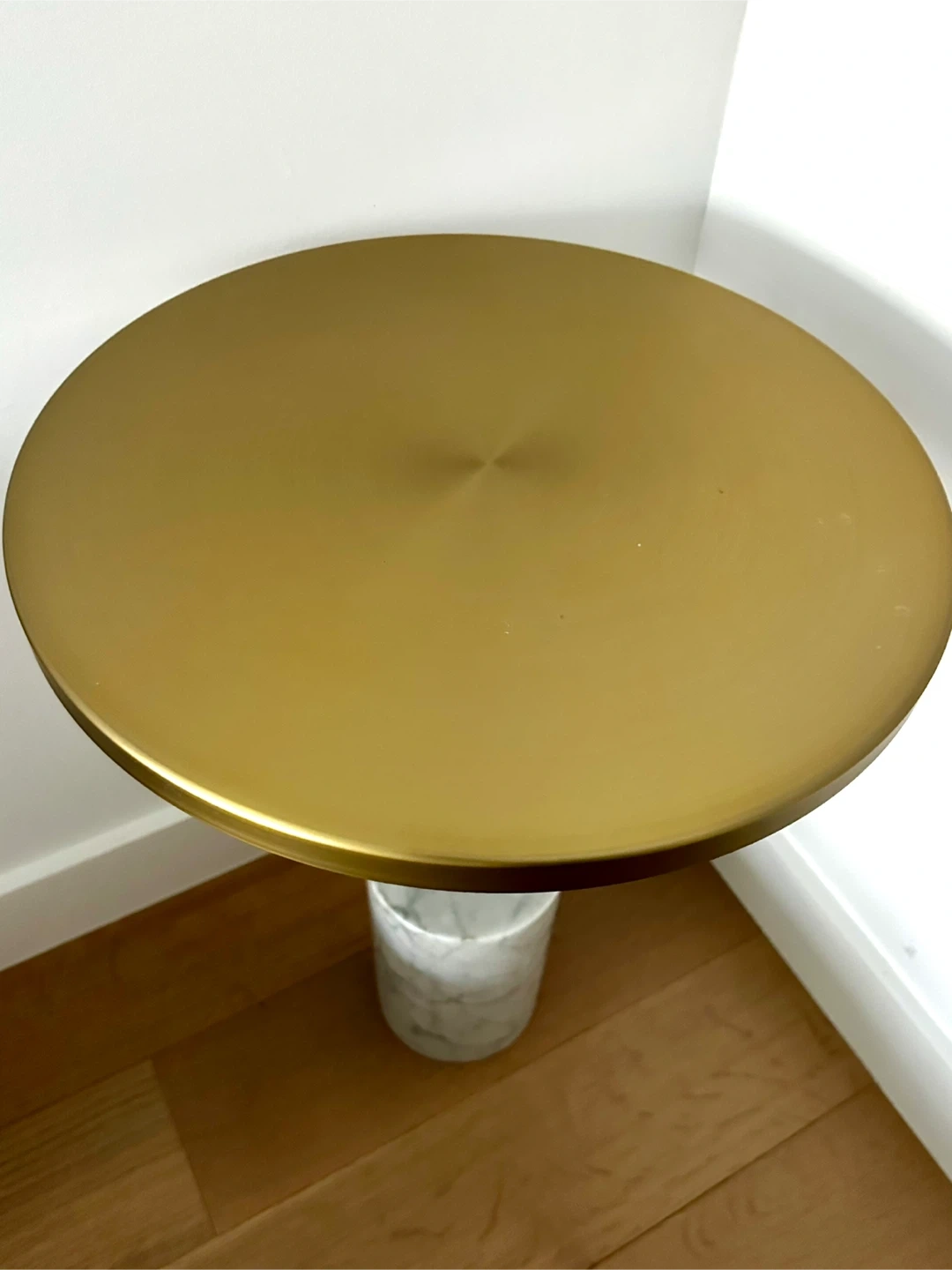 Selling a stylish accent table from Article! It features a sleek brass top and a sturdy marble base. Perfect for adding a touch of elegance to any room. Excellent condition
