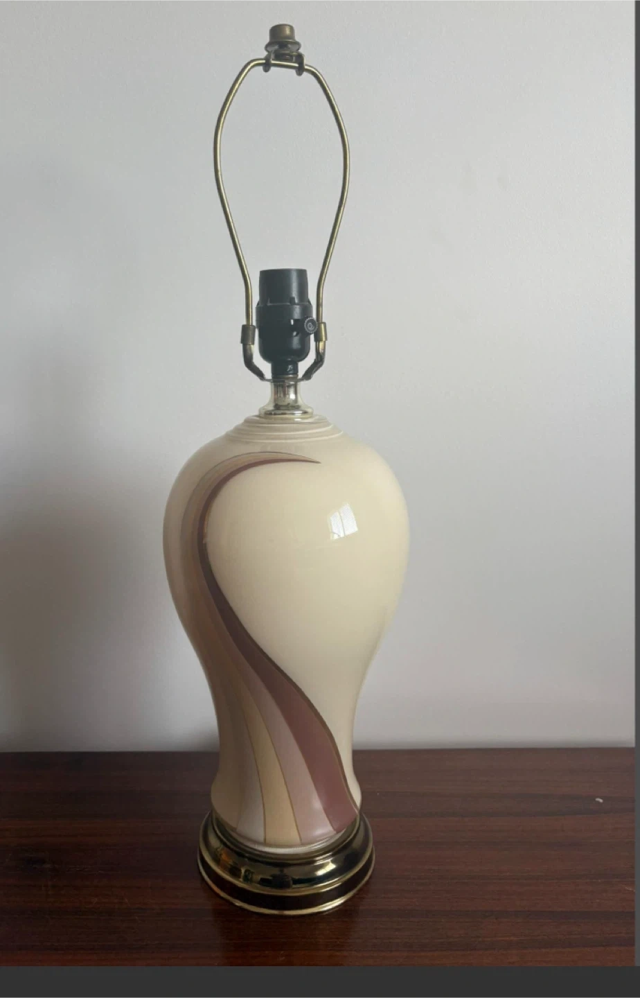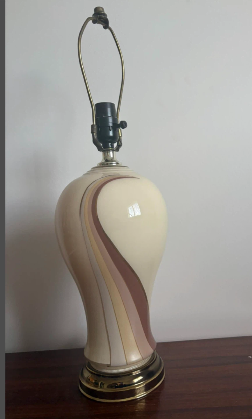 Selling a vintage ceramic table lamp. It features a cream-colored body with a unique brown swirl design. The base and hardware are gold-toned, giving it a classic look. It's in great condition and would add a touch of retro charm to any room