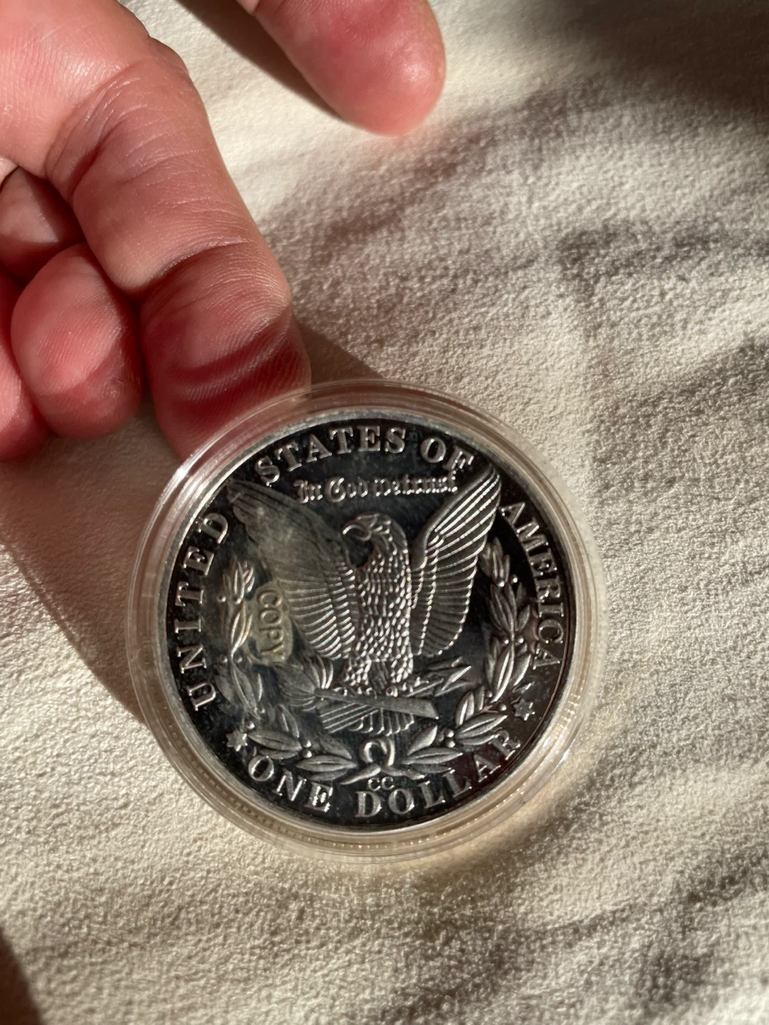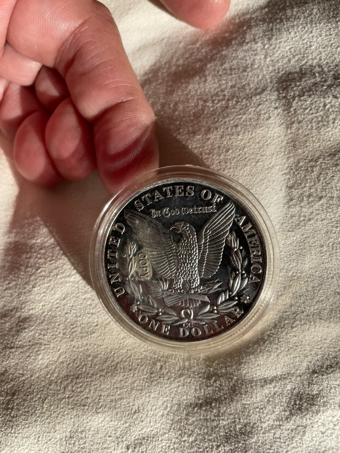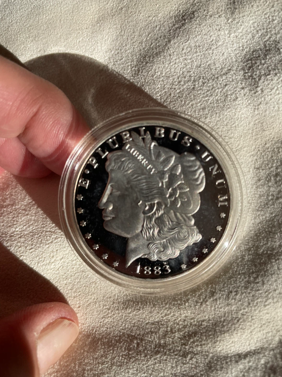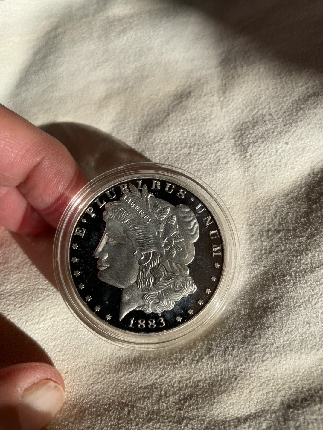 751883 Morgan Silver Dollar! Copy. It's in great condition and comes in a protective case