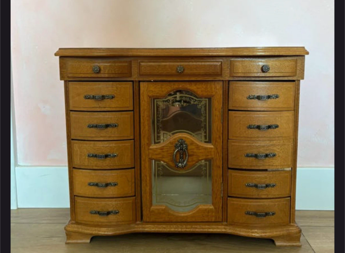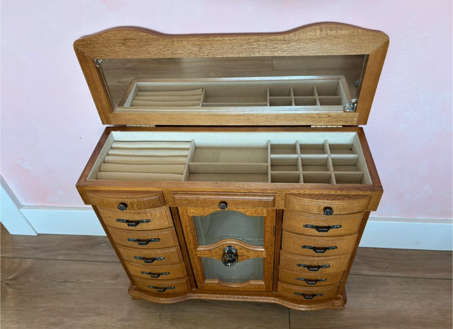 Here's a lovely wooden jewelry box cabinet! It has lots of drawers and compartments for storing all your precious pieces. The top lifts up to reveal a mirror, perfect for getting ready. It's in great condition and ready to find a new home