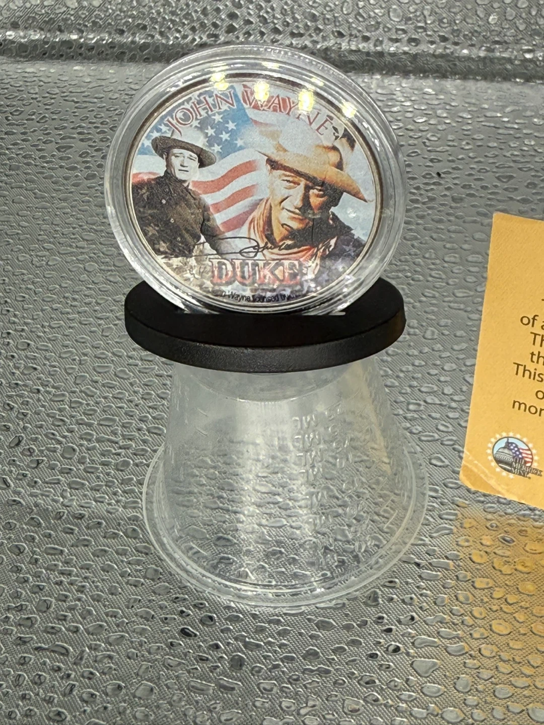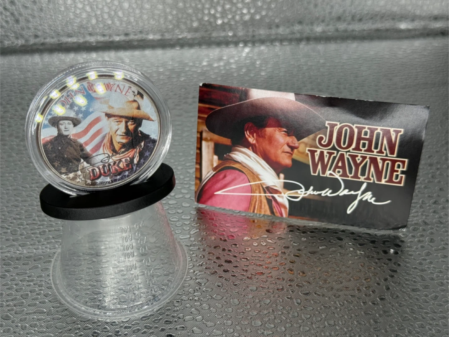 75Selling a John Wayne 'The Duke' collector silver coin. It comes with a Certificate of Authenticity, ensuring its genuine status as United States Legal Tender. The coin features a full-color portrait of John Wayne, achieved through a revolutionary new colorizing technique. A great addition to any collection!