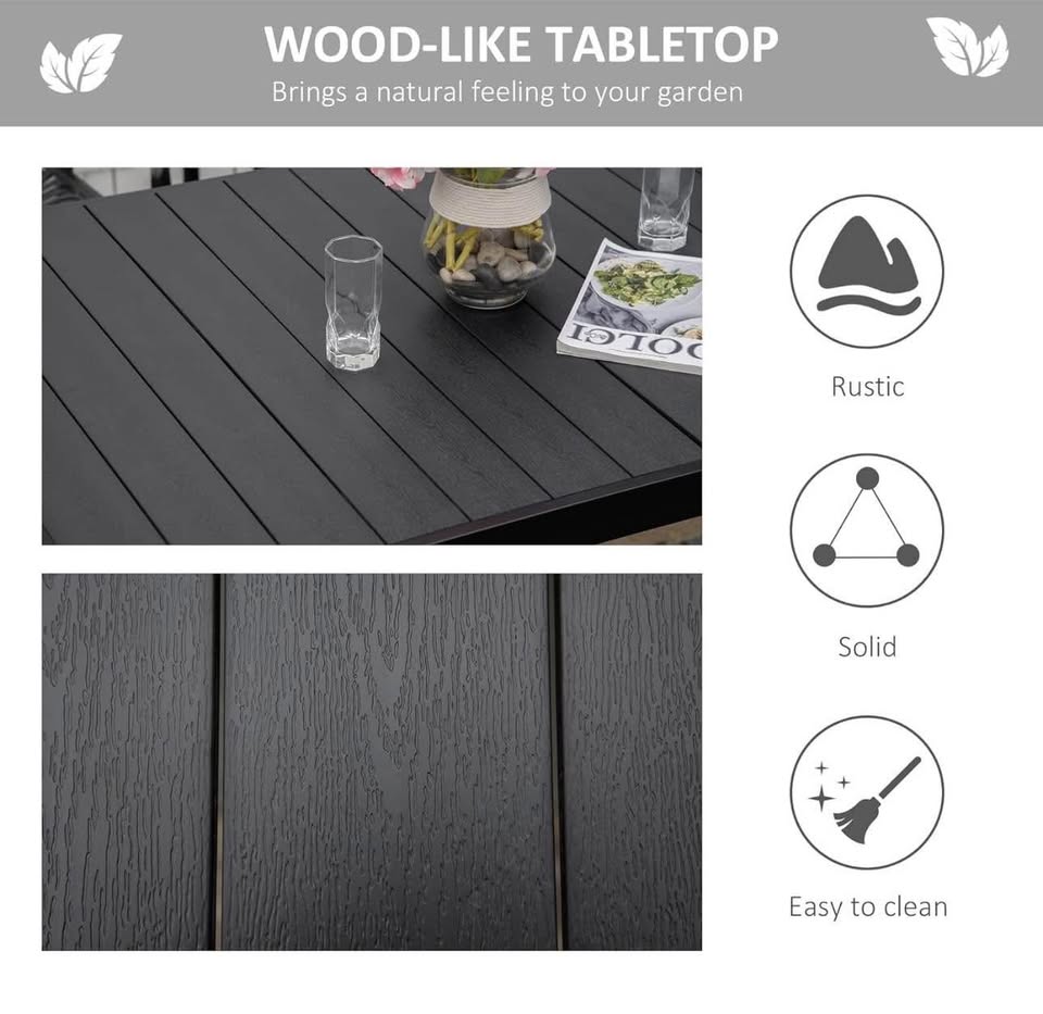 Wood-Like Table Top: The plastic slats on the top of the rectangle patio table imitate wood for style, but are tougher and more durable, and it's quick-drying after rain and easy to clean with a wet cloth.