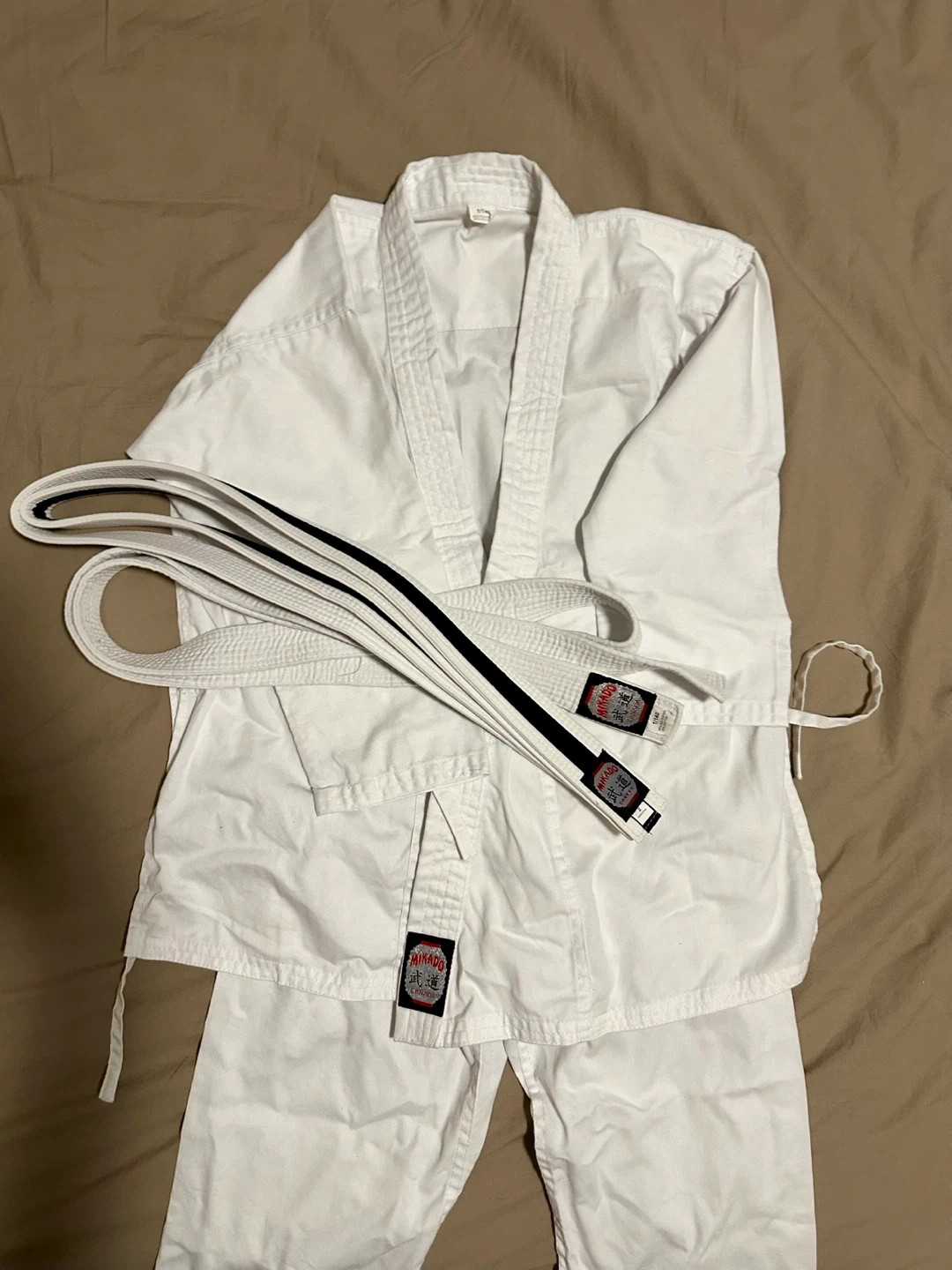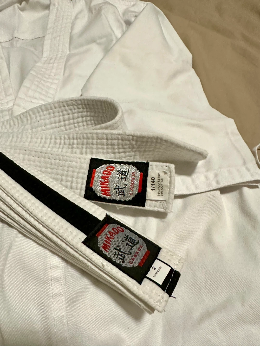 Selling a Mikado karate gi set in great condition! The set includes the gi (top and pants) and two belts - plain white and white with a black stripe. The size is 1/140.
