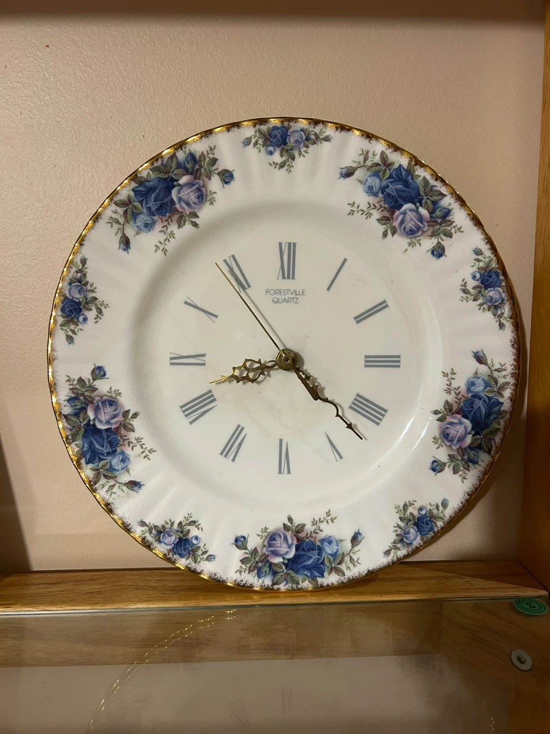 Royal Albert Quartz clock designed to look like a decorative plate! It features a delicate floral pattern with blue roses and a gold trim. A unique and stylish addition to any room! Untested.