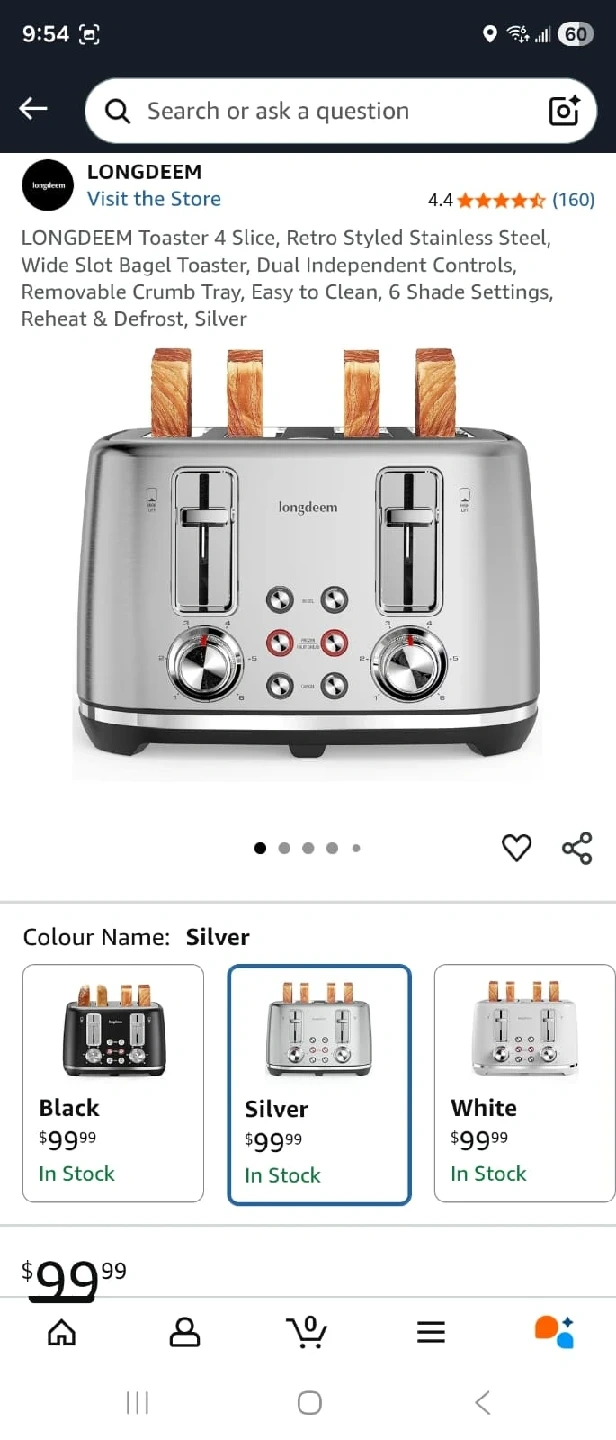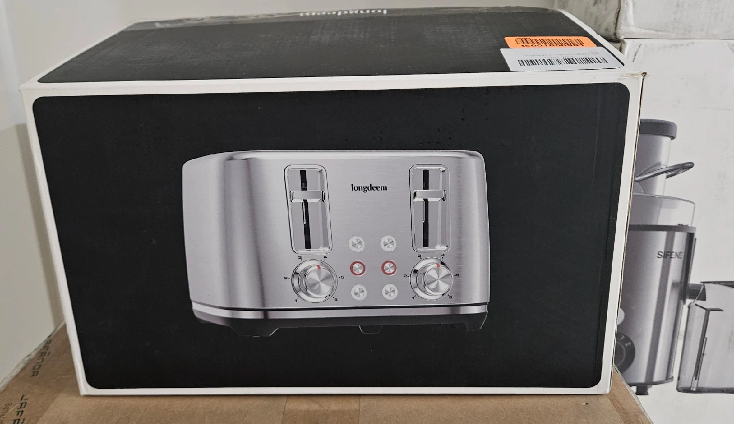 Selling a brand new Longdeem 4-slice toaster! It's a retro-styled toaster made of stainless steel. This model has wide slots, perfect for bagels, and dual independent controls. Also features a removable crumb tray, is easy to clean, and has 6 shade settings, with reheat and defrost options. Originally for $99.99