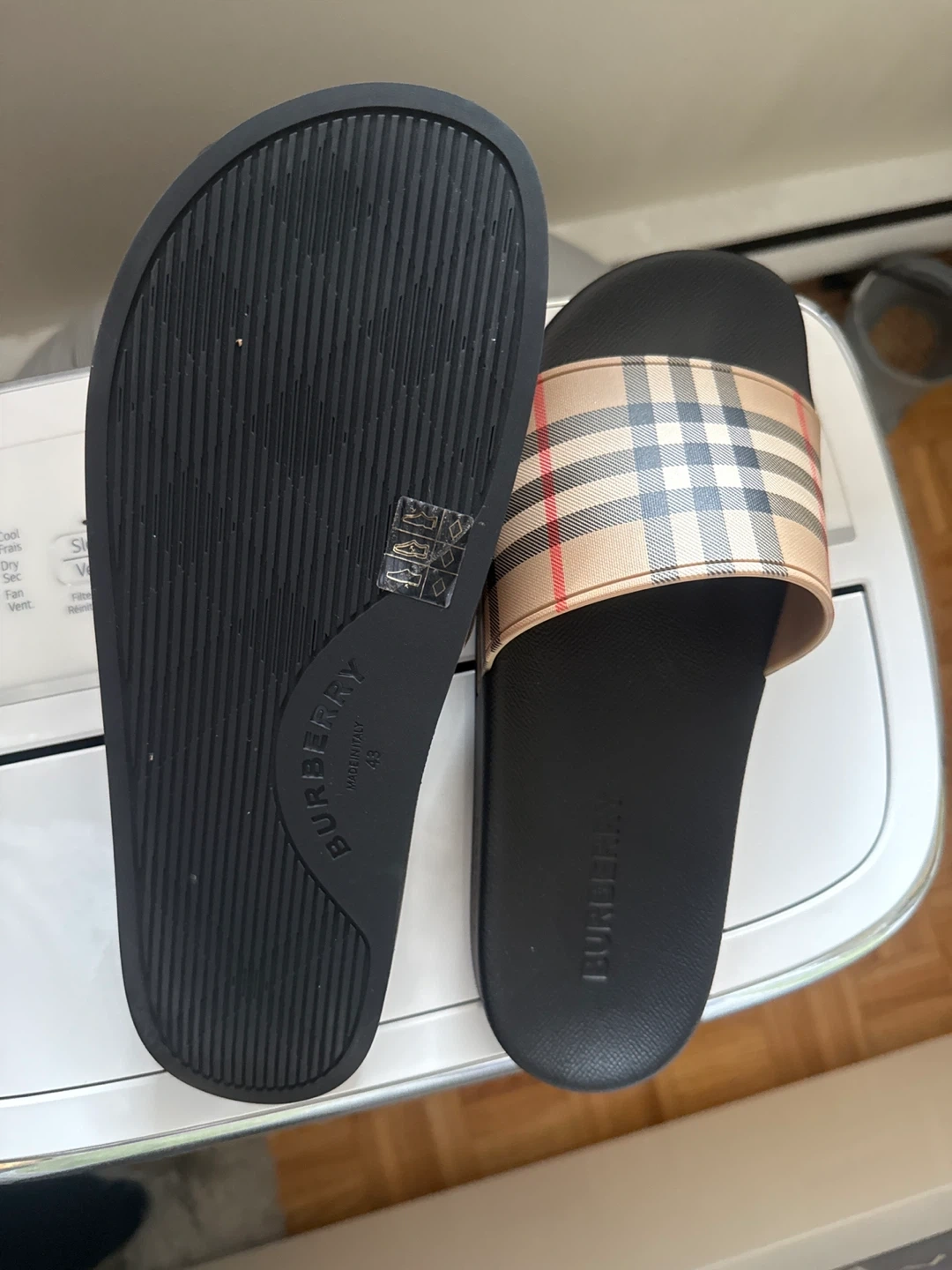 Selling a pair of Burberry slides in black. They feature the classic Burberry check pattern on the strap. Size 43 brand new I have receipt to show proof of purchase/authenticity