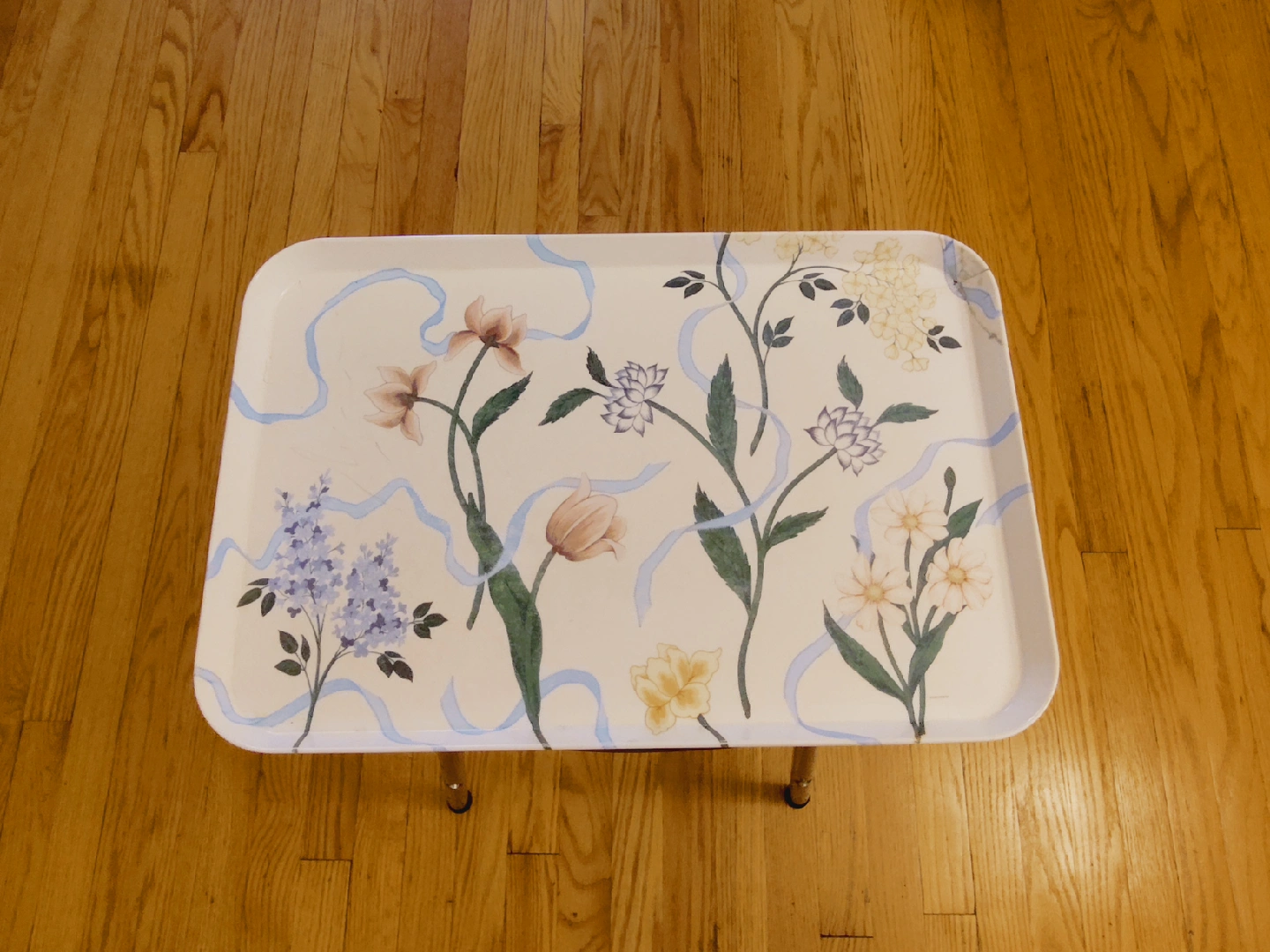 Free serving tray table with a floral pattern! It has a cream-colored base with beautiful floral designs and light blue ribbon accents. Must give away 10/29-10/30 morning