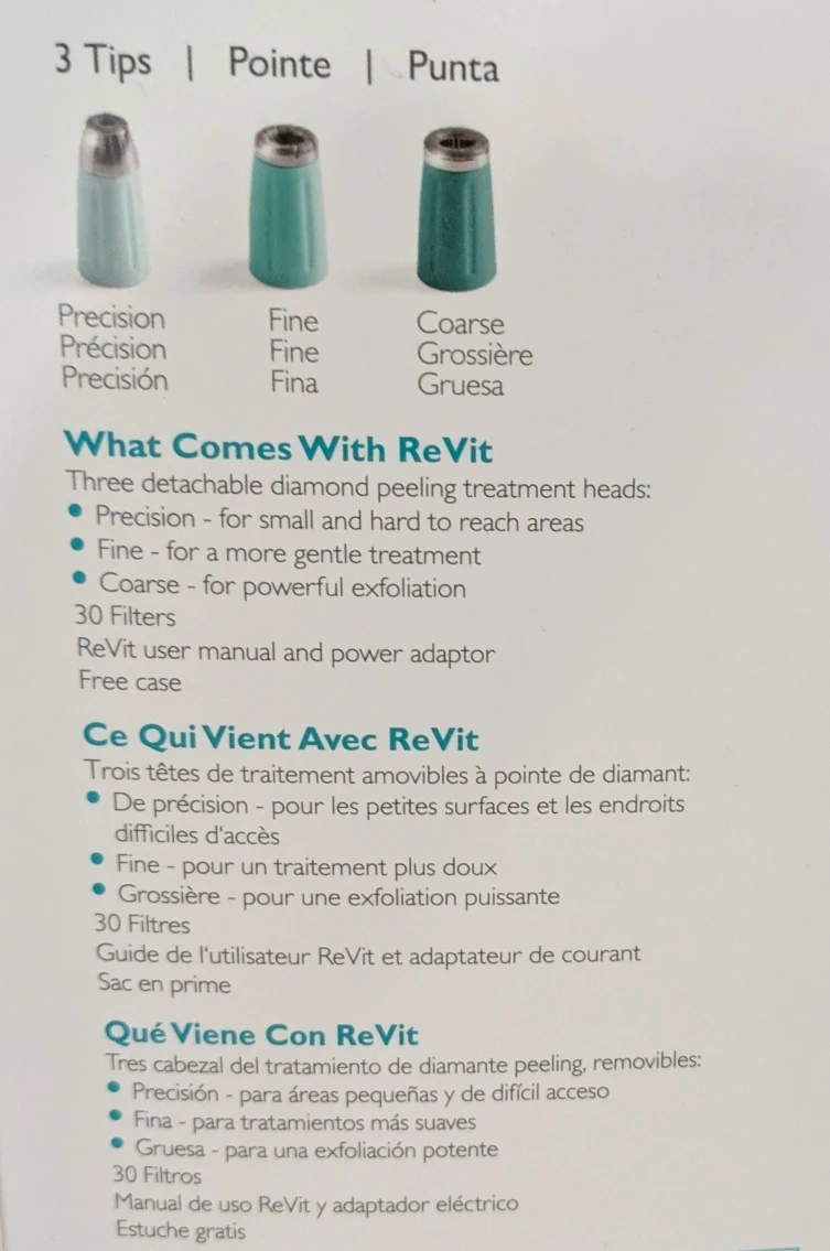 - Three detachable diamond peeling treatment heads: Precision, Fine, and Coarse