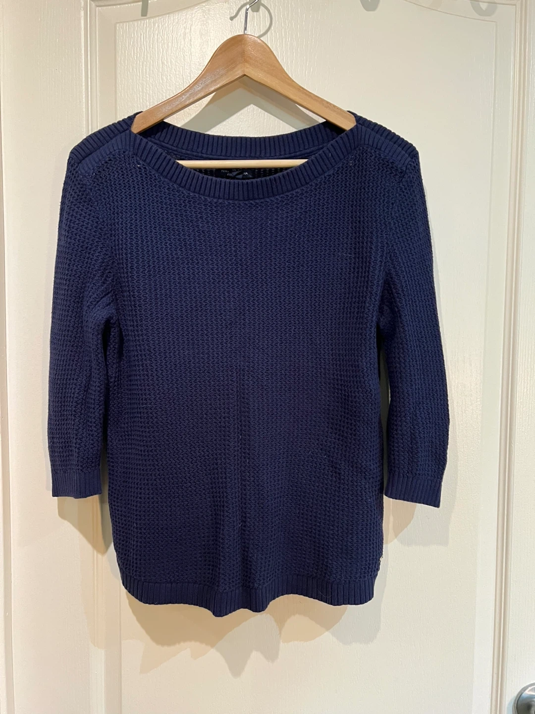 Tommy Hilfiger sweater in size medium. Navy blue with nautical shoulder detail. A loose knit so it’s not too hot, great for layering.