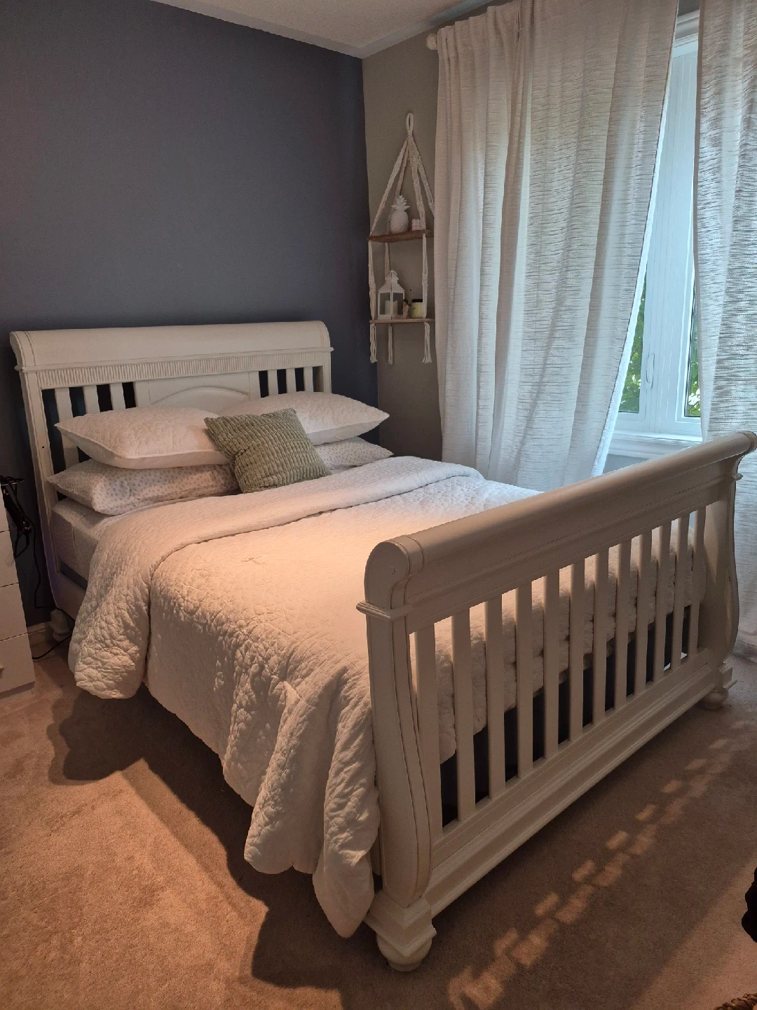 Selling a lovely white bed frame! It's in great condition and would look beautiful in any bedroom. The bed frame has a classic sleigh design with a curved headboard and footboard.