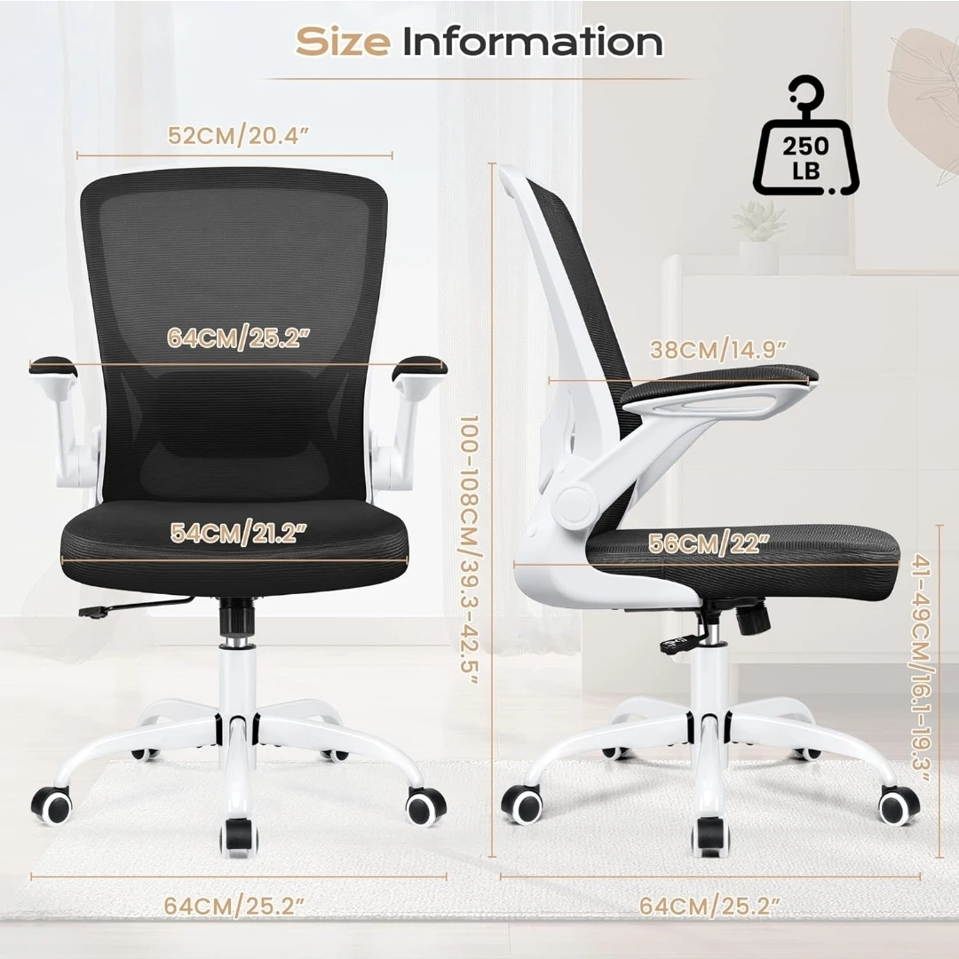Pick up only. Selling a brand new mesh office chair in black and white. It features a breathable mesh back, adjustable height, and flip-up armrests.
