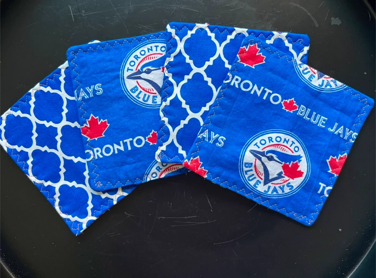 Show your team spirit with these handmade Toronto Blue Jays coasters! This set of 4 features a vibrant blue design with the Blue Jays logo and a touch of Canadian pride with the maple leaf. Perfect for protecting your furniture while cheering on your favourite team!