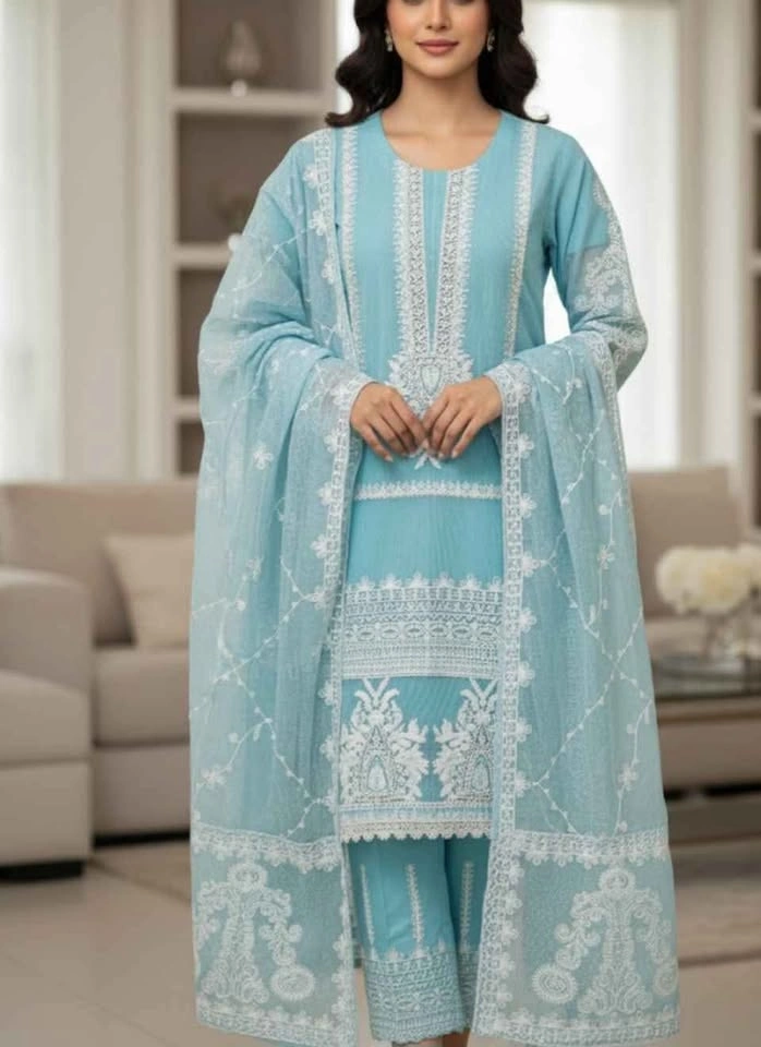 Beautiful sky blue 3 pcs cotton net thread embroidery and pearl work suit with embroidered cotton net dupatta along embroidered plazo. Size Medium. Price $65
