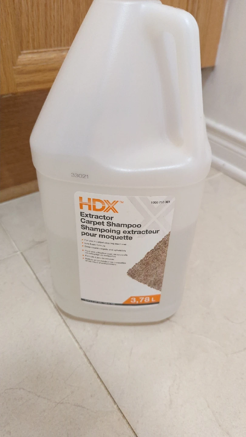 Most of a jug of HDX Extractor Carpet Shampoo. It's perfect for use in carpet cleaning machines. This shampoo features a low foam formula and deep cleans carpets and upholstery.