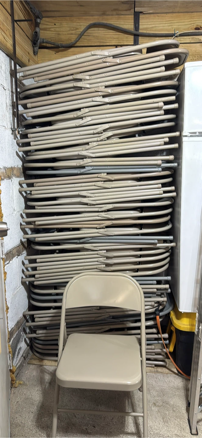 Selling a stack of folding chairs. They are beige in color and in good condition. Perfect for events or extra seating! Only 10 dlls each one