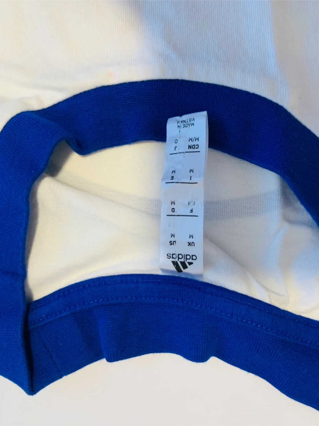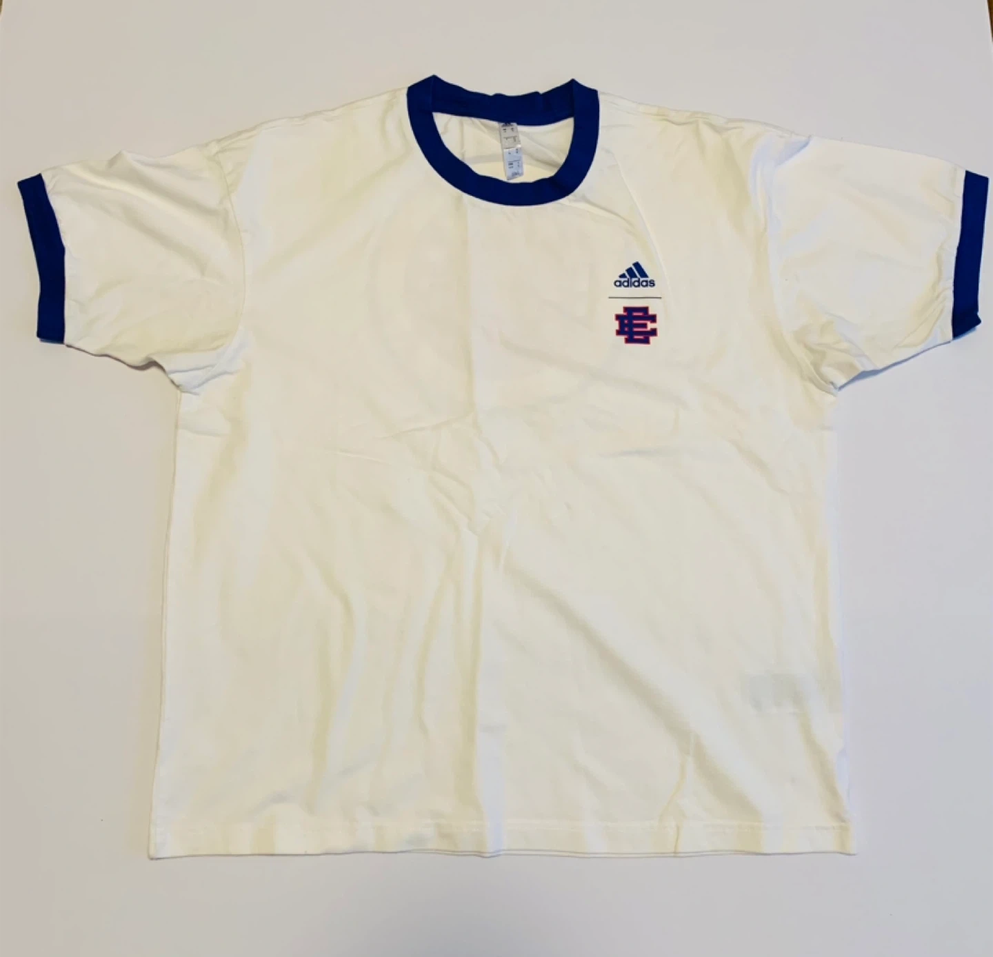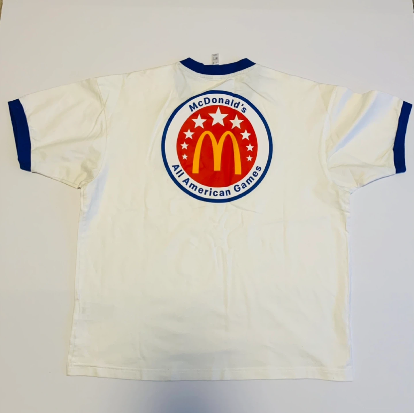 Selling an Adidas T-shirt from the McDonald's All American Games. It's a size M and features a white body with blue trim. The back has the McDonald's All American Games logo. Great for any fan or collector!