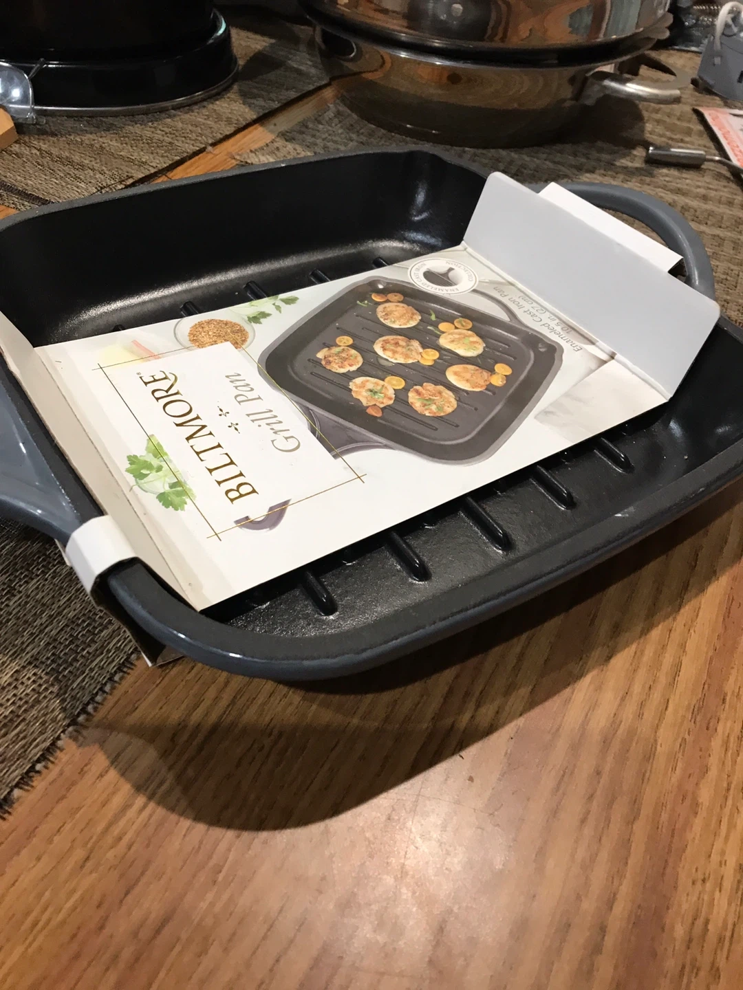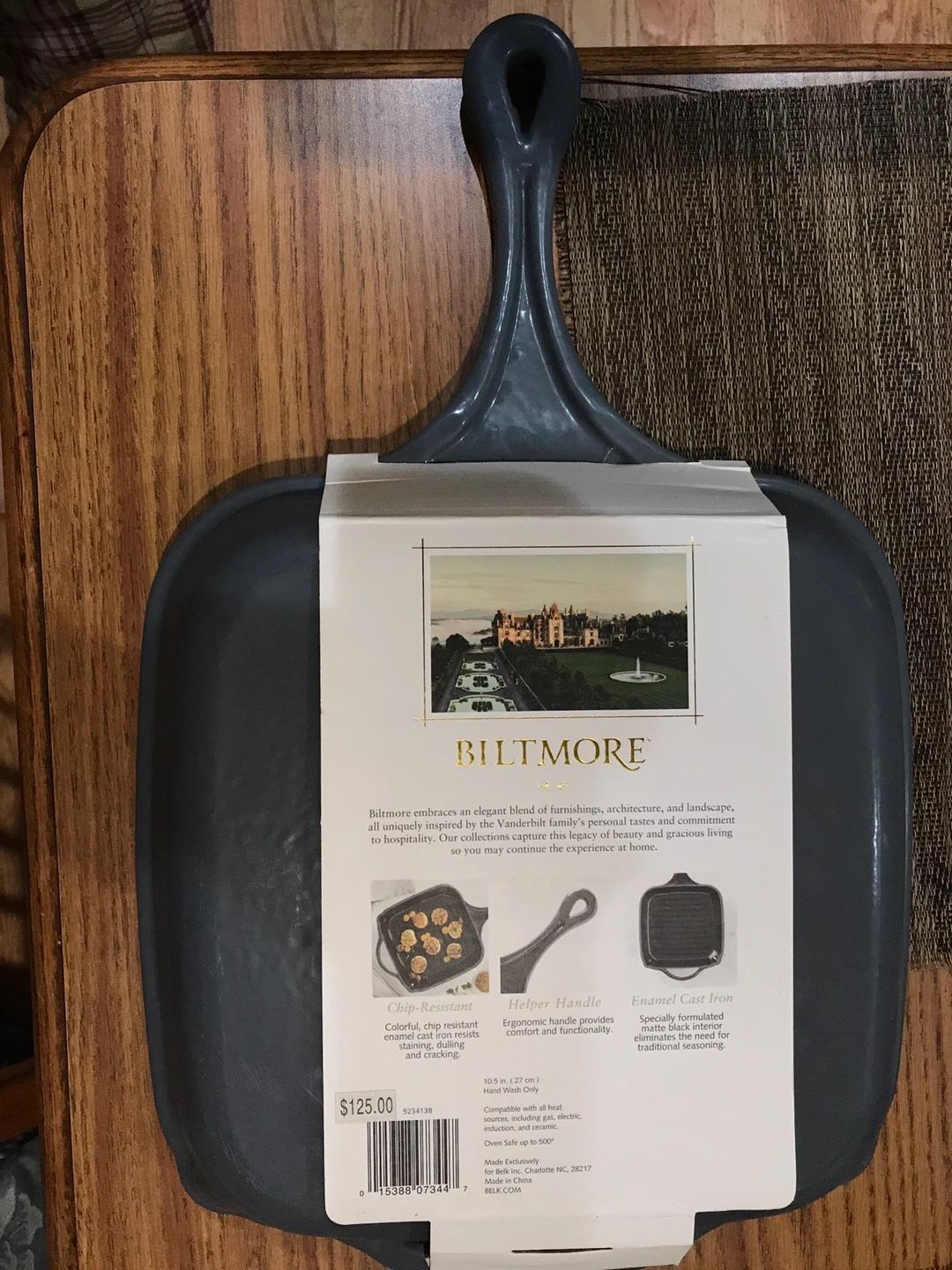 I'm selling a brand new Biltmore Enameled Cast Iron Grill Pan! It's a 10.5 inch (27 cm) pan, perfect for indoor grilling. The enamel cast iron provides even heating and is easy to clean. Originally bought for $125.00
