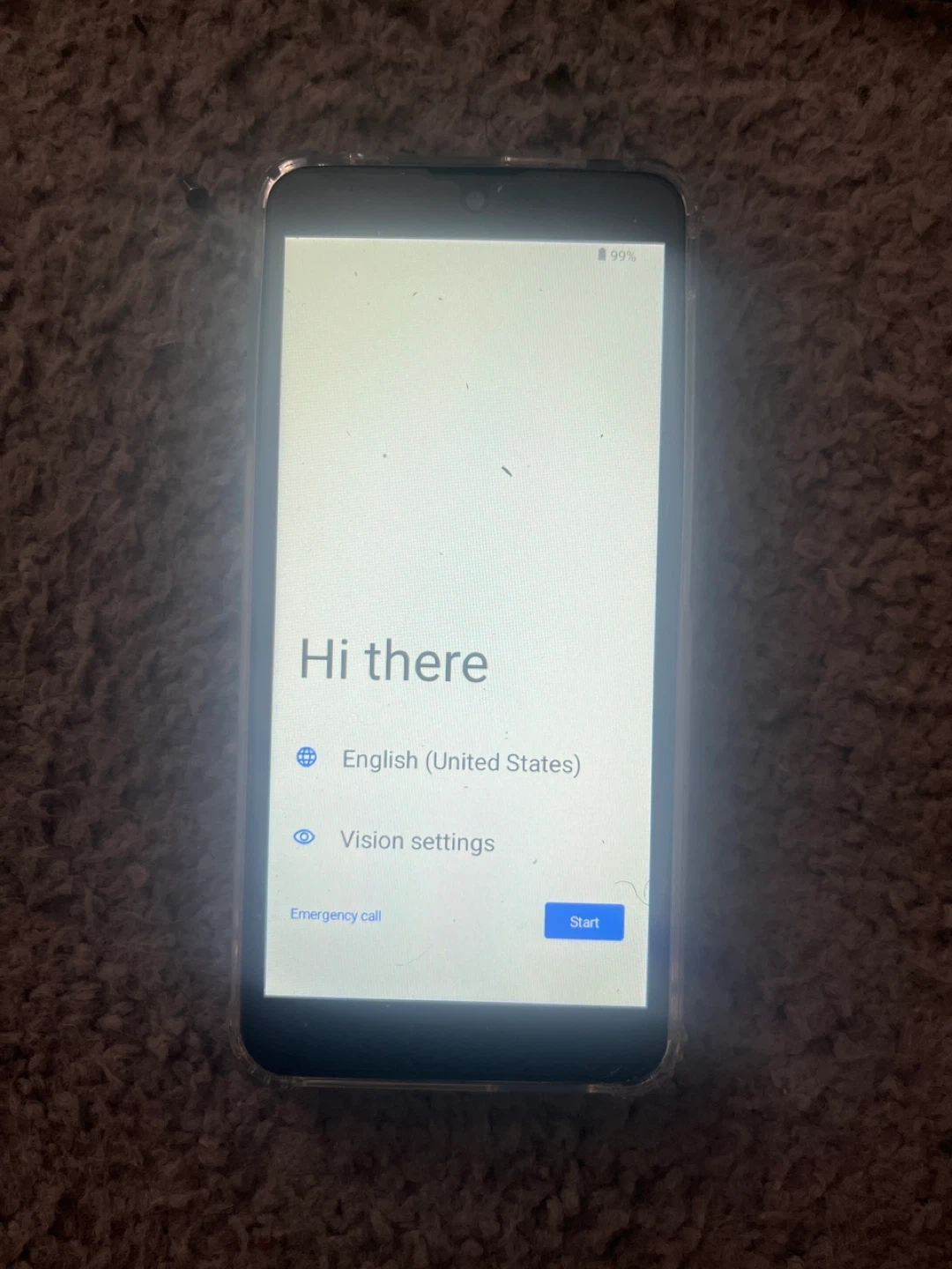 Selling an unlocked smartphone. It appears to be in great condition and ready for a new user. The screen displays the initial setup options.