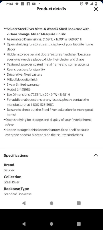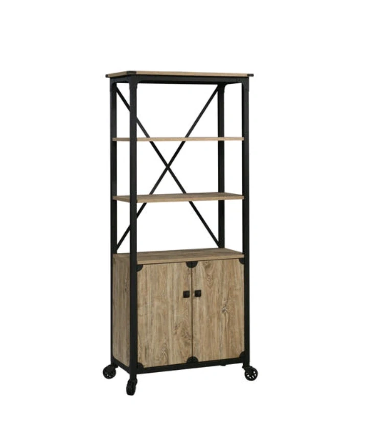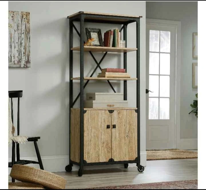 Selling a Sauder Steel River Metal & Wood 3-Shelf Bookcase with 2-Door Storage in Milled Mesquite Finish! It features open shelving for storage and display, hidden storage behind doors, and a textured, powder-coated metal frame with corner accents. The bookcase also has rear crossbars for stability and decorative, fixed casters.