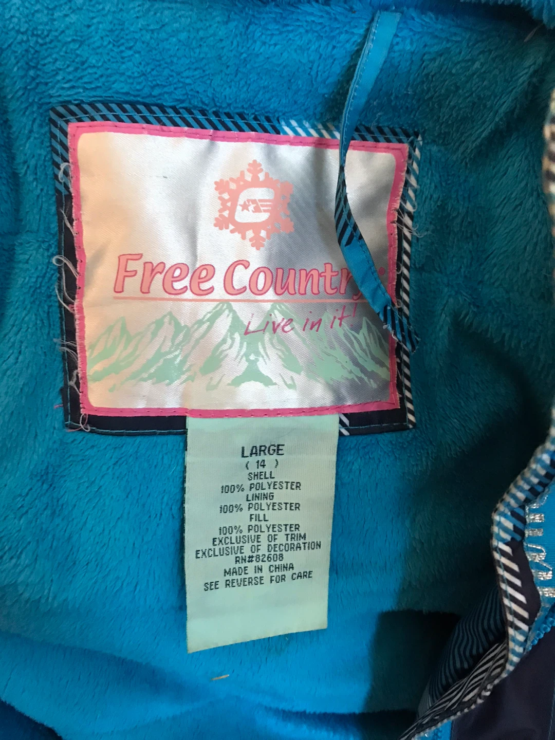 Selling a Free Country girl's jacket in size large. It features a stylish blue plaid pattern with a faux fur trim on the hood. The jacket is made of 100% polyester and has a comfortable lining. Perfect for keeping warm and looking great!
