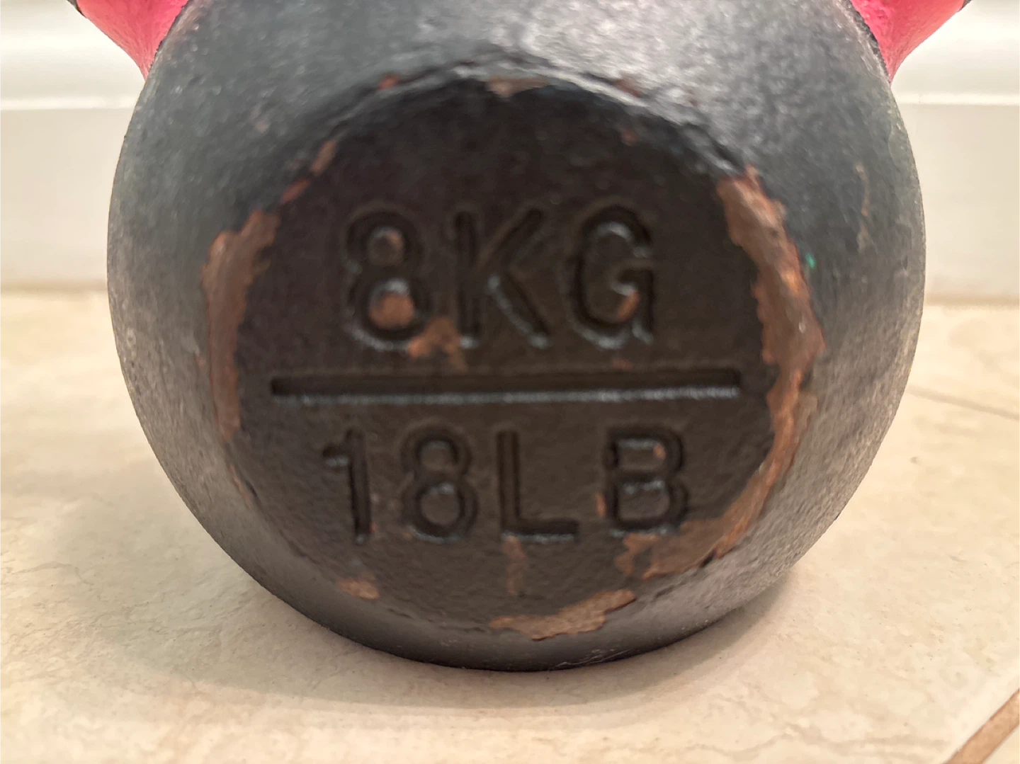 Selling a kettlebell, marked as 8KG or 18LB. It shows some signs of wear, as you can see in the photos, but it's still perfectly functional for your workouts