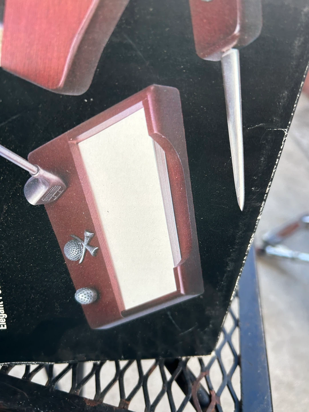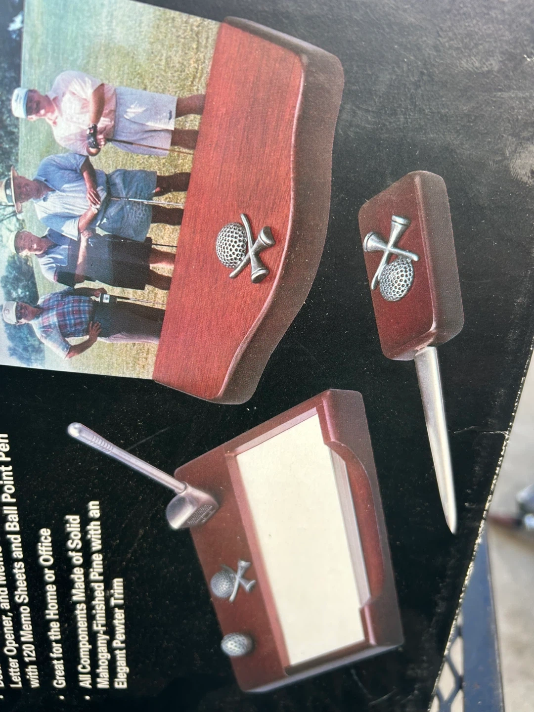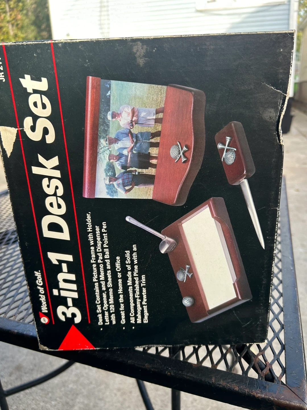 This is a World of Golf 3-in-1 Desk Set. The set includes a picture frame with holder, letter opener, and memo pad dispenser with 120 memo sheets and ballpoint pen. All components are made of solid mahogany-finished pine with an elegant pewter trim. Great for the home or office