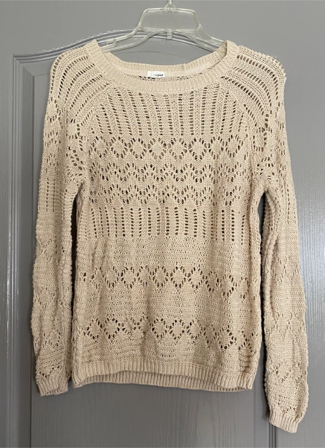 Cozy and stylish, this Old Navy knit sweater is perfect for layering! It's a lovely beige colour and features a unique open knit design. Great for adding a touch of texture to any outfit