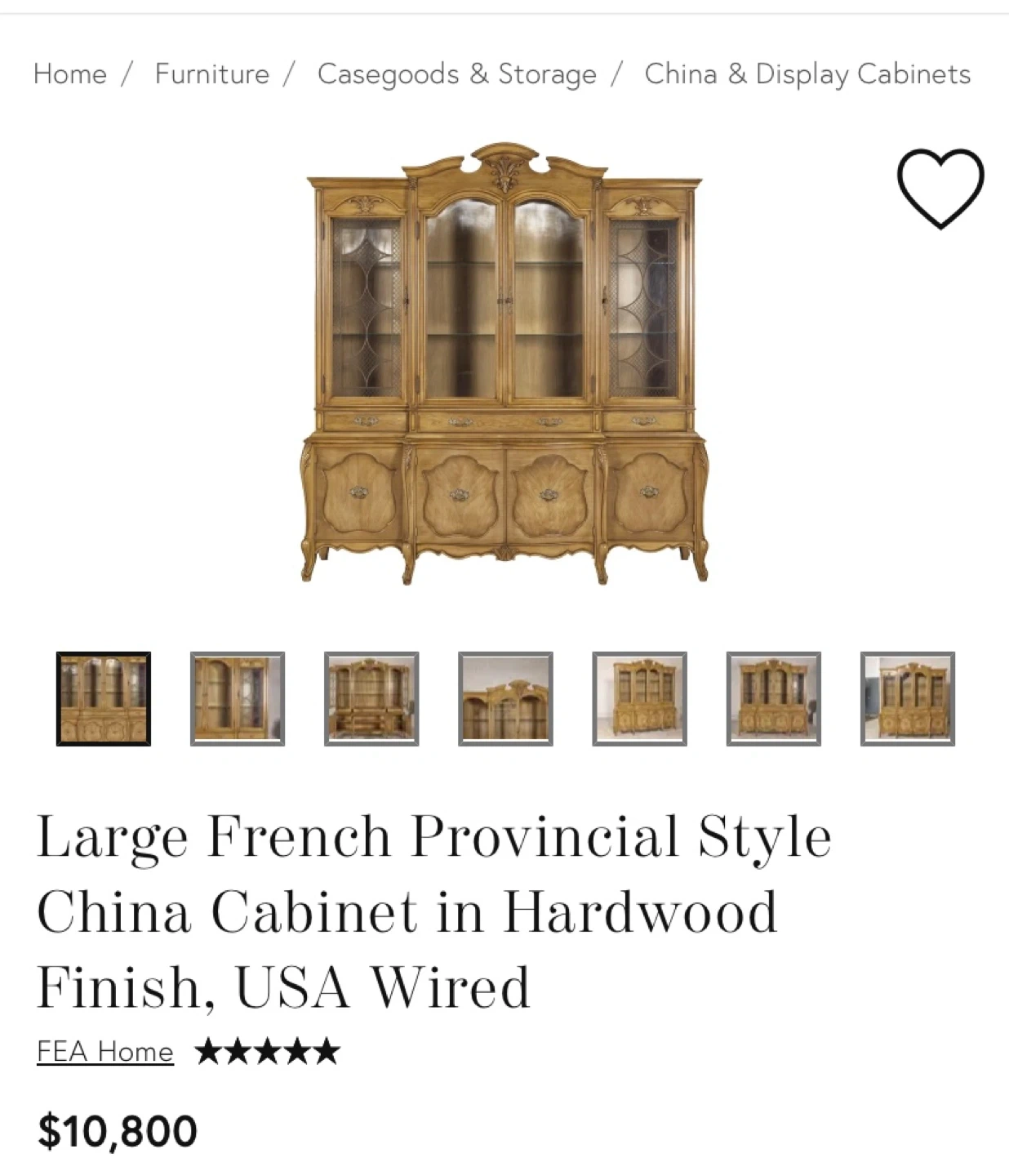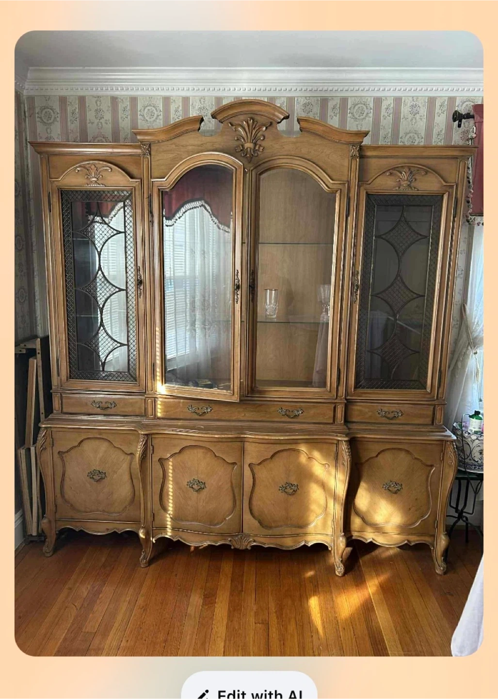 Selling a large French Provincial style china cabinet from FEA Home. It features a hardwood finish and is USA wired. Originally bought for $10,800