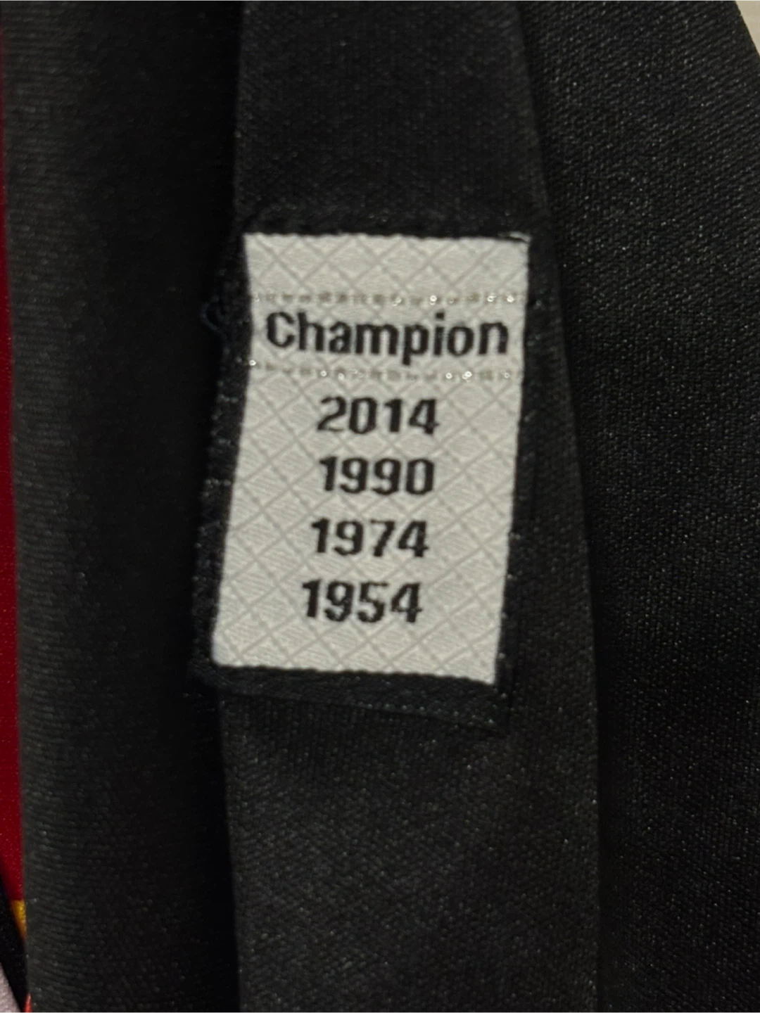 It features the German flag colours on the sleeves and the German eagle crest on the chest. The shirt also has a tag with the years 2014, 1990, 1974 and 1954, commemorating Germany's World Cup victories.